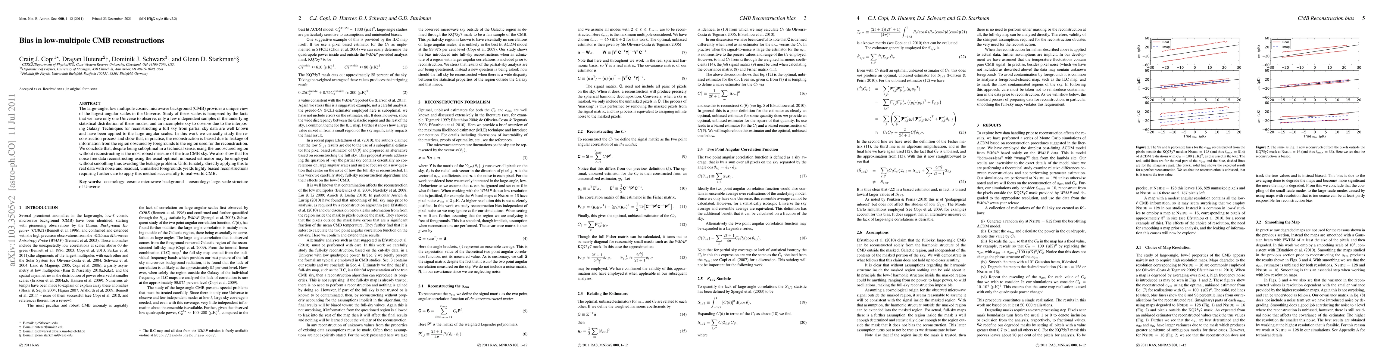 The large-angle, low multipole cosmic microwave background (CMB) provides a unique view of the largest angular scales in the Universe. Study of these scales is hampered by the facts that we have only one Universe to observe, only a few independent samples of the underlying statistical distribution of these modes, and an incomplete sky to observe due to the interposing Galaxy. Techniques for reconstructing a full sky from partial sky data are well known and have been applied to the large angular scales. In this work we critically study the reconstruction process and show that, in practise, the reconstruction is biased due to leakage of information from the region obscured by foregrounds to the region used for the reconstruction. We conclude that, despite being suboptimal in a technical sense, using the unobscured region without reconstructing is the most robust measure of the true CMB sky. We also show that for noise free data reconstructing using the usual optimal, unbiased estimator may be employed without smoothing thus avoiding the leakage problem. Unfortunately, directly applying this to real data with noise and residual, unmasked foregrounds yields highly biased reconstructions requiring further care to apply this method successfully to real-world CMB.