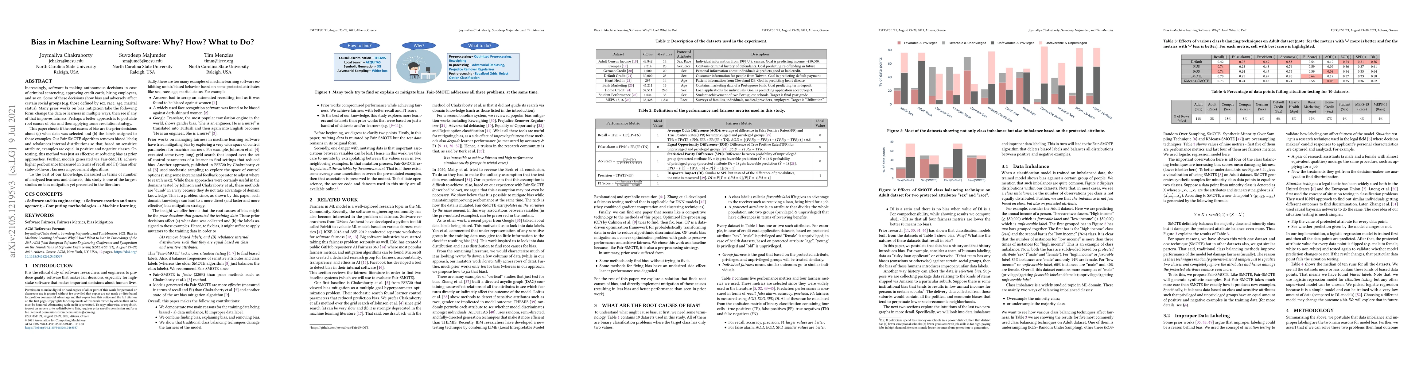 Increasingly, software is making autonomous decisions in case of criminal sentencing, approving credit cards, hiring employees, and so on. Some of these decisions show bias and adversely affect certain social groups (e.g. those defined by sex, race, age, marital status). Many prior works on bias mitigation take the following form: change the data or learners in multiple ways, then see if any of that improves fairness. Perhaps a better approach is to postulate root causes of bias and then applying some resolution strategy. This paper postulates that the root causes of bias are the prior decisions that affect- (a) what data was selected and (b) the labels assigned to those examples. Our Fair-SMOTE algorithm removes biased labels; and rebalances internal distributions such that based on sensitive attribute, examples are equal in both positive and negative classes. On testing, it was seen that this method was just as effective at reducing bias as prior approaches. Further, models generated via Fair-SMOTE achieve higher performance (measured in terms of recall and F1) than other state-of-the-art fairness improvement algorithms. To the best of our knowledge, measured in terms of number of analyzed learners and datasets, this study is one of the largest studies on bias mitigation yet presented in the literature.