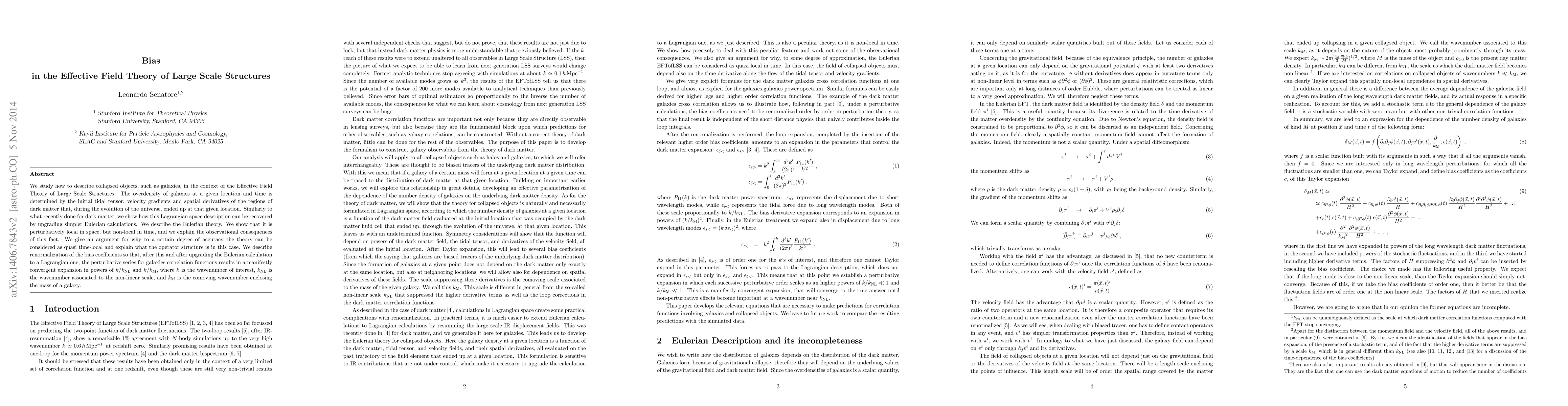 This paper explores the Effective Field Theory for describing large scale structures, focusing on the bias in collapsed objects like galaxies. It demonstrates how to upgrade Eulerian calculations to a Lagrangian description, revealing the theory's perturbative local spatial nature but non-local temporal behavior, and discusses renormalization of bias coefficients to achieve a convergent perturbative series.