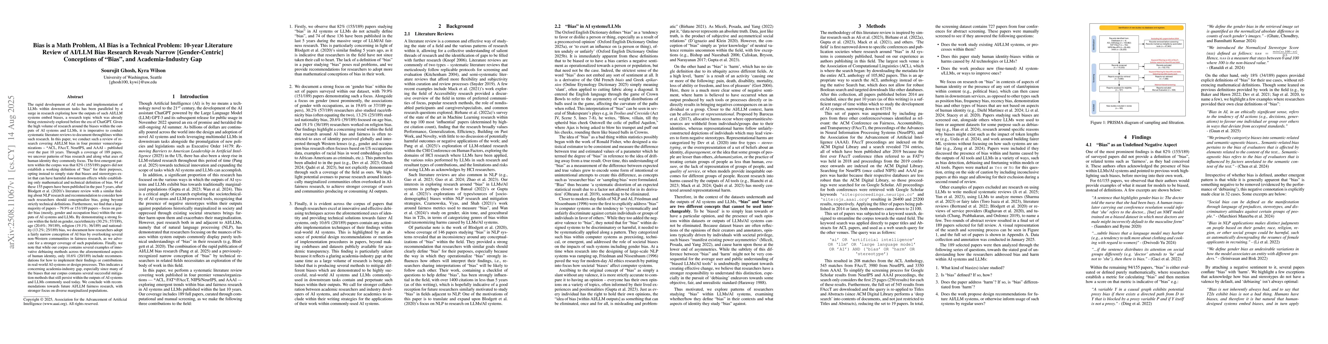 The rapid development of AI tools and implementation of LLMs within downstream tasks has been paralleled by a surge in research exploring how the outputs of such AI/LLM systems embed biases, a research topic which was already being extensively explored before the era of ChatGPT. Given the high volume of research around the biases within the outputs of AI systems and LLMs, it is imperative to conduct systematic literature reviews to document throughlines within such research. In this paper, we conduct such a review of research covering AI/LLM bias in four premier venues/organizations -- *ACL, FAccT, NeurIPS, and AAAI -- published over the past 10 years. Through a coverage of 189 papers, we uncover patterns of bias research and along what axes of human identity they commonly focus. The first emergent pattern within the corpus was that 82% (155/189) papers did not establish a working definition of "bias" for their purposes, opting instead to simply state that biases and stereotypes exist that can have harmful downstream effects while establishing only mathematical and technical definition of bias. 94 of these 155 papers have been published in the past 5 years, after Blodgett et al. (2020)'s literature review with a similar finding about NLP research and recommendation to consider how such researchers should conceptualize bias, going beyond strictly technical definitions. Furthermore, we find that a large majority of papers -- 79.9% or 151/189 papers -- focus on gender bias (mostly, gender and occupation bias) within the outputs of AI systems and LLMs. By demonstrating a strong focus within the field on gender, race/ethnicity (30.2%; 57/189), age (20.6%; 39/189), religion (19.1%; 36/189) and nationality (13.2%; 25/189) bias, we document how researchers adopt a fairly narrow conception of AI bias by overlooking several non-Western communities in fairness research, as we advocate for a stronger coverage of such populations. Finally, we note that while our corpus contains several examples of innovative debiasing methods across the aforementioned aspects of human identity, only 10.6% (20/189) include recommendations for how to implement their findings or contributions in real-world AI systems or design processes. This indicates a concerning academia-industry gap, especially since many of the biases that our corpus contains several successful mitigation methods that still persist within the outputs of AI systems and LLMs commonly used today. We conclude with recommendations towards future AI/LLM fairness research, with stronger focus on diverse marginalized populations.