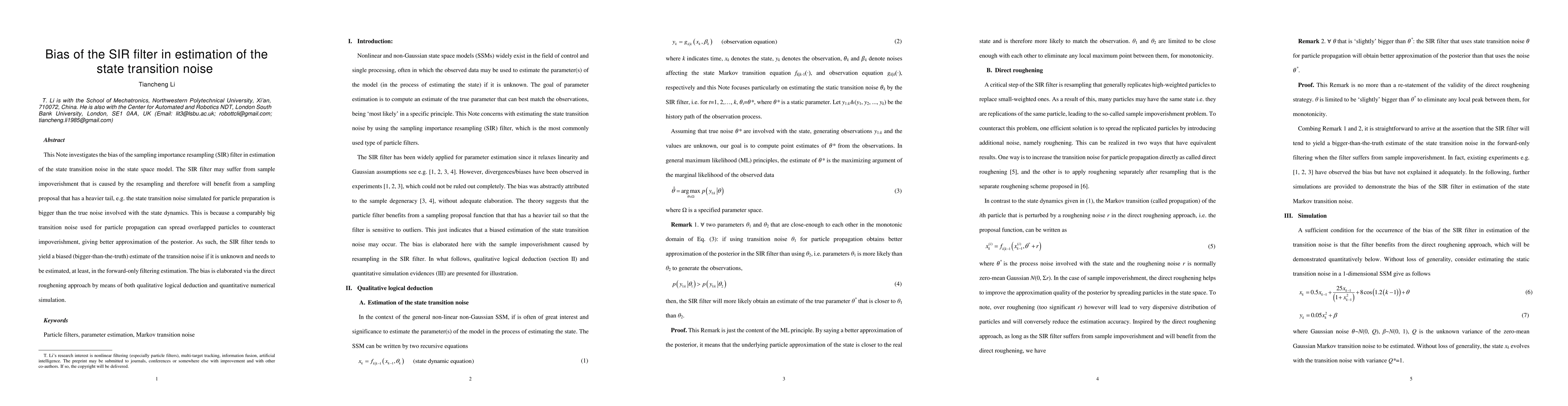 This paper investigates the bias in the SIR filter's estimation of state transition noise due to sample impoverishment, showing that using a larger simulated noise for particle propagation can mitigate this issue. The SIR filter tends to overestimate the transition noise, a bias demonstrated through logical deduction and numerical simulations.