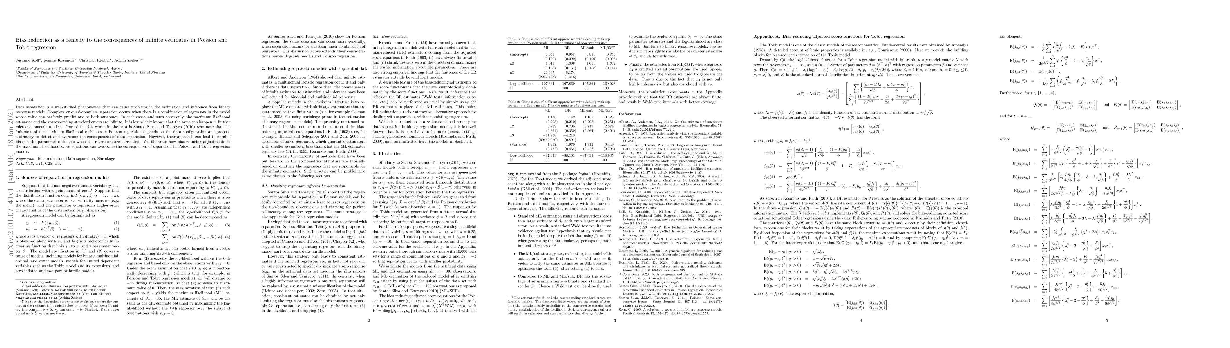 This paper addresses the issue of infinite estimates in Poisson and Tobit regression models due to data separation, proposing bias-reducing adjustments to the maximum likelihood score equations to mitigate the consequences and improve parameter estimates. The method aims to correct notable bias that arises when regressors are correlated, enhancing the reliability of the estimates.