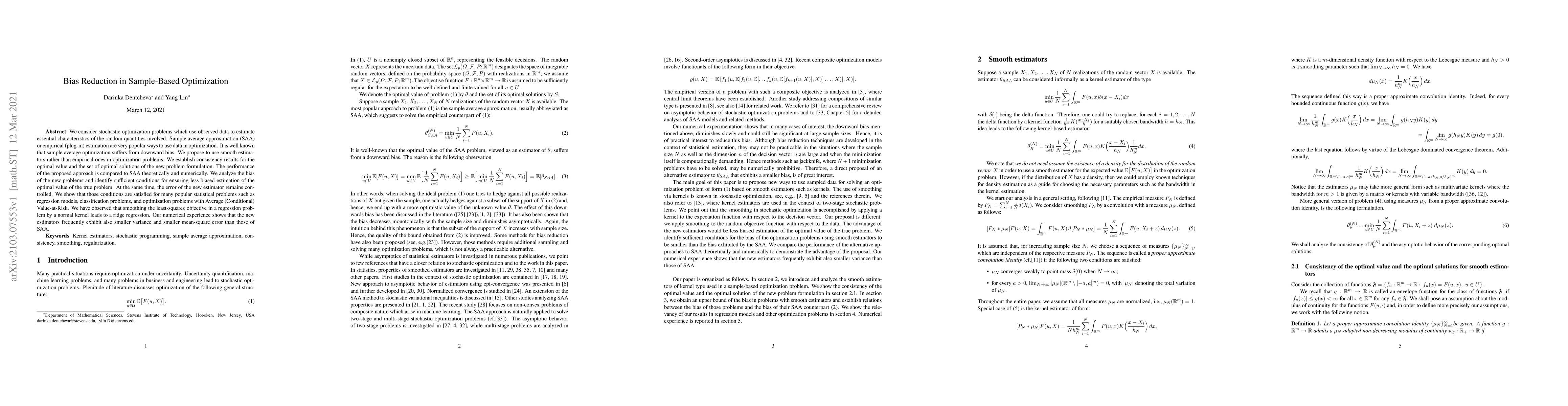 This research proposes using smooth estimators instead of empirical ones in optimization problems to reduce downward bias in Sample Average Optimization (SAA). It establishes consistency results for the optimal value and solution set, and demonstrates through theory and numerical experiments that the new approach often has less bias, smaller variance, and smaller mean-square error than SAA. The method is applicable to various statistical problems including regression models, classification problems, and optimization problems with Average/Conditional Value-at-Risk.