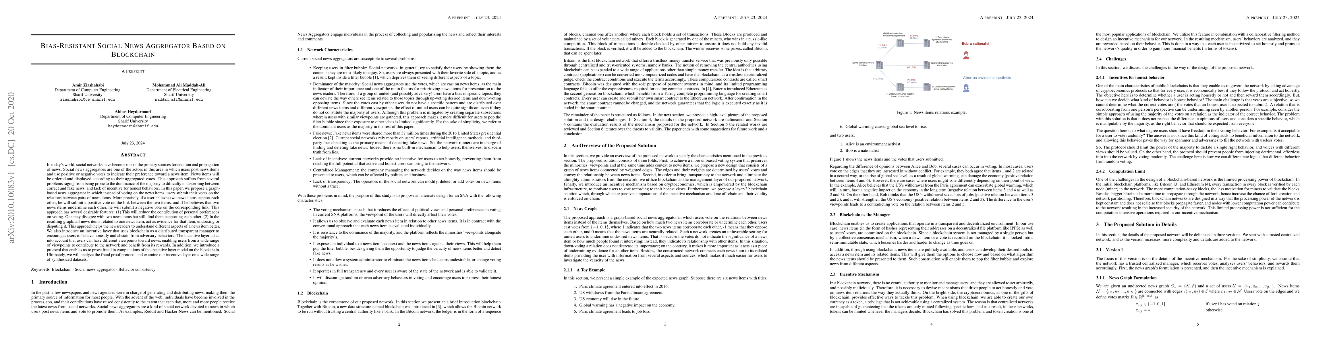 This paper proposes a blockchain-based social news aggregator that mitigates biases by having users vote on relationships between news items rather than the items themselves, thus reducing the influence of personal preferences. It introduces an incentive layer using blockchain to promote honest behavior and includes a fraud proof protocol to verify computations.