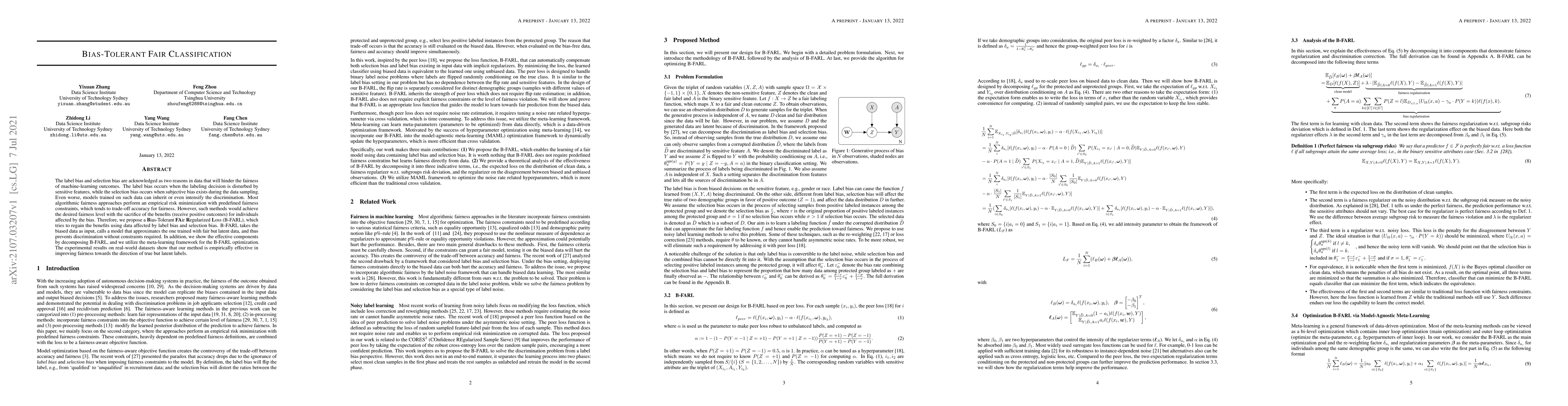 The label bias and selection bias are acknowledged as two reasons in data that will hinder the fairness of machine-learning outcomes. The label bias occurs when the labeling decision is disturbed by sensitive features, while the selection bias occurs when subjective bias exists during the data sampling. Even worse, models trained on such data can inherit or even intensify the discrimination. Most algorithmic fairness approaches perform an empirical risk minimization with predefined fairness constraints, which tends to trade-off accuracy for fairness. However, such methods would achieve the desired fairness level with the sacrifice of the benefits (receive positive outcomes) for individuals affected by the bias. Therefore, we propose a Bias-TolerantFAirRegularizedLoss (B-FARL), which tries to regain the benefits using data affected by label bias and selection bias. B-FARL takes the biased data as input, calls a model that approximates the one trained with fair but latent data, and thus prevents discrimination without constraints required. In addition, we show the effective components by decomposing B-FARL, and we utilize the meta-learning framework for the B-FARL optimization. The experimental results on real-world datasets show that our method is empirically effective in improving fairness towards the direction of true but latent labels.
