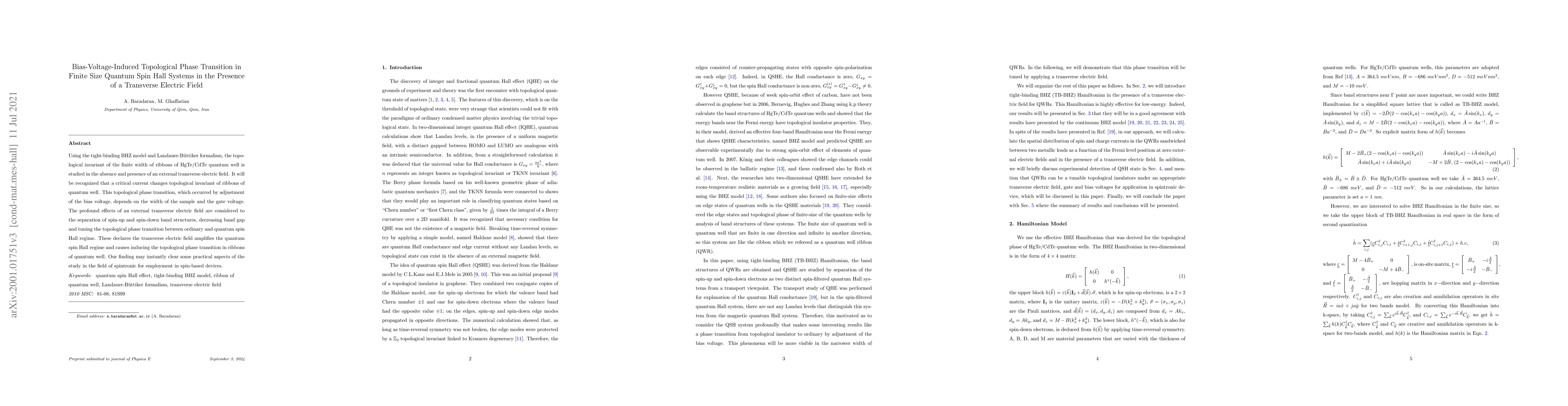 Using the tight-binding BHZ model and Landauer-B\"uttiker formalism, the topological invariant of the finite width of ribbons of HgTe/CdTe quantum well is studied in the absence and presence of an external transverse electric field. It will be recognized that a critical current changes topological invariant of ribbons of quantum well. This topological phase transition, which occurred by adjustment of the bias voltage, depends on the width of the sample and the gate voltage. The profound effects of an external transverse electric field are considered to the separation of spin-up and spin-down band structures, decreasing band gap and tuning the topological phase transition between ordinary and quantum spin Hall regime. These declares the transverse electric field amplifies the quantum spin Hall regime and causes inducing the topological phase transition in ribbons of quantum well. Our finding may instantly clear some practical aspects of the study in the field of spintronic for employment in spin-based devices.