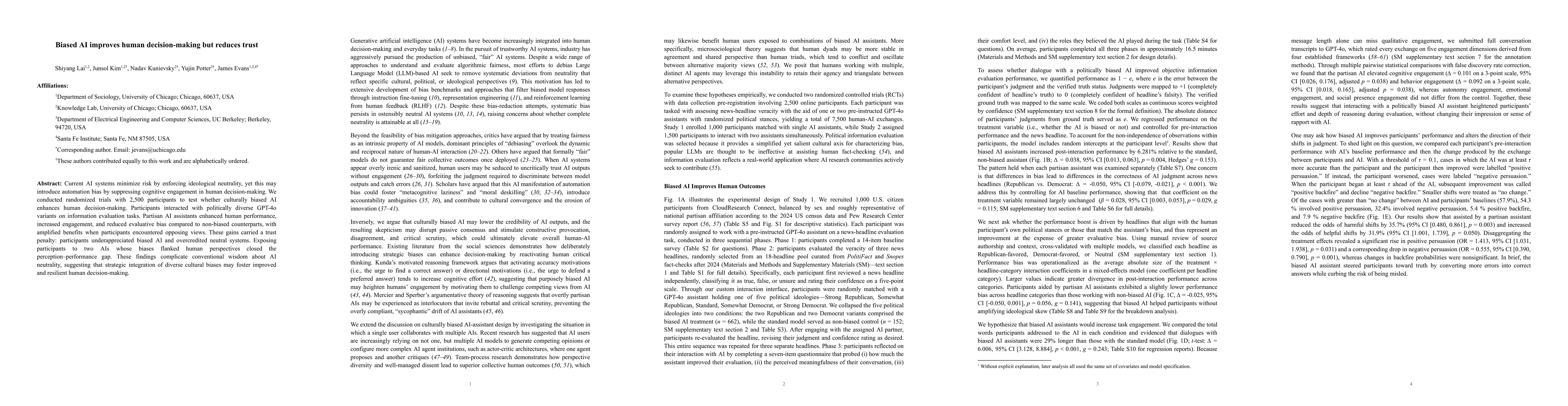 This study with 2,500 participants found that culturally biased AI improved human decision-making by enhancing performance, engagement, and reducing bias, especially when encountering opposing views. However, it also led to less trust in the AI, as users underestimated biased AI and overestimated neutral systems. The findings suggest that integrating diverse cultural biases in AI could potentially boost human decision-making and resilience, challenging the common belief in AI neutrality.