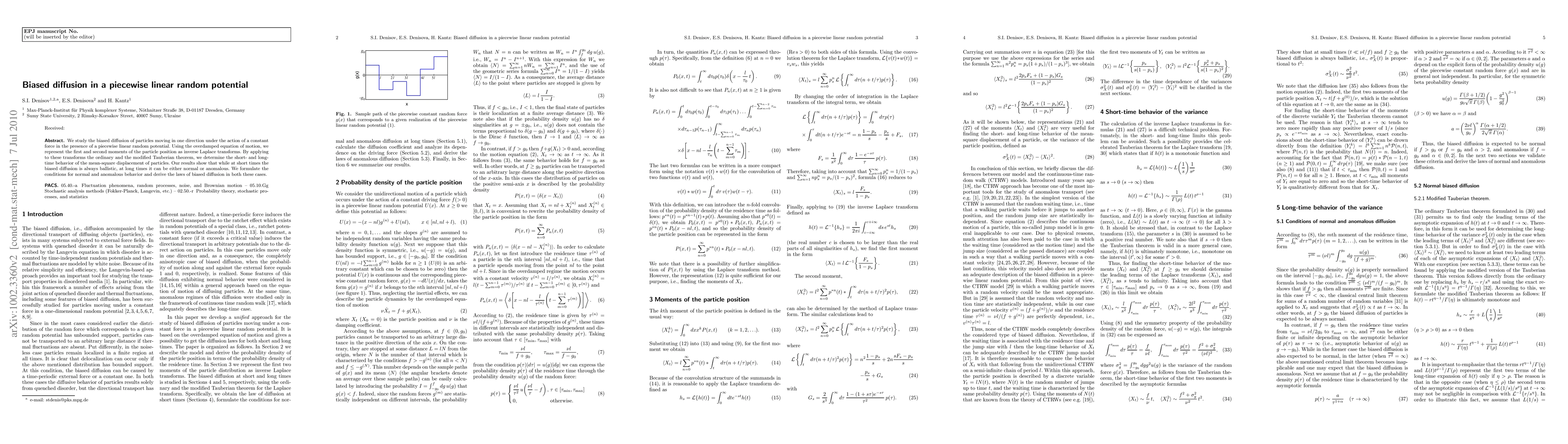 We study the biased diffusion of particles moving in one direction under the action of a constant force in the presence of a piecewise linear random potential. Using the overdamped equation of motion, we represent the first and second moments of the particle position as inverse Laplace transforms. By applying to these transforms the ordinary and the modified Tauberian theorem, we determine the short- and long-time behavior of the mean-square displacement of particles. Our results show that while at short times the biased diffusion is always ballistic, at long times it can be either normal or anomalous. We formulate the conditions for normal and anomalous behavior and derive the laws of biased diffusion in both these cases.