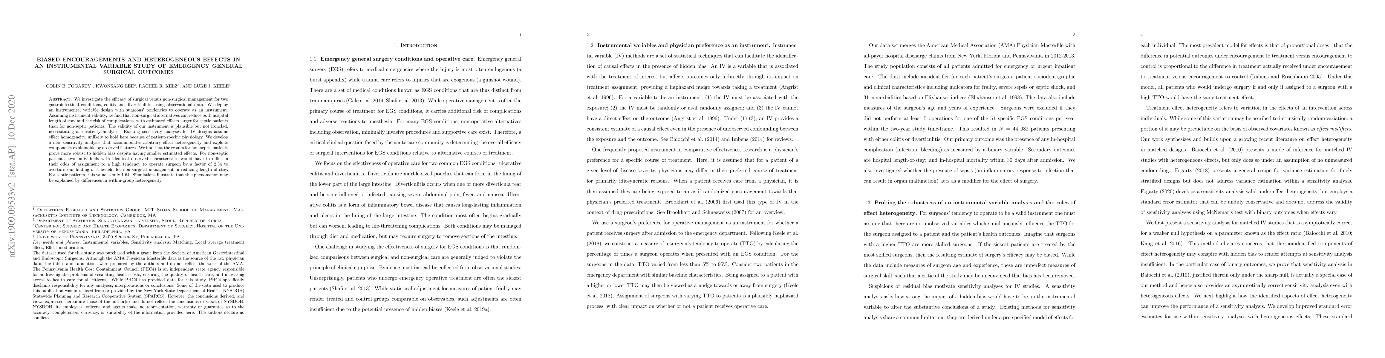 We investigate the efficacy of surgical versus non-surgical management for two gastrointestinal conditions, colitis and diverticulitis, using observational data. We deploy an instrumental variable design with surgeons' tendencies to operate as an instrument. Assuming instrument validity, we find that non-surgical alternatives can reduce both hospital length of stay and the risk of complications, with estimated effects larger for septic patients than for non-septic patients. The validity of our instrument is plausible but not ironclad, necessitating a sensitivity analysis. Existing sensitivity analyses for IV designs assume effect homogeneity, unlikely to hold here because of patient-specific physiology. We develop a new sensitivity analysis that accommodates arbitrary effect heterogeneity and exploits components explainable by observed features. We find that the results for non-septic patients prove more robust to hidden bias despite having smaller estimated effects. For non-septic patients, two individuals with identical observed characteristics would have to differ in their odds of assignment to a high tendency to operate surgeon by a factor of 2.34 to overturn our finding of a benefit for non-surgical management in reducing length of stay. For septic patients, this value is only 1.64. Simulations illustrate that this phenomenon may be explained by differences in within-group heterogeneity.