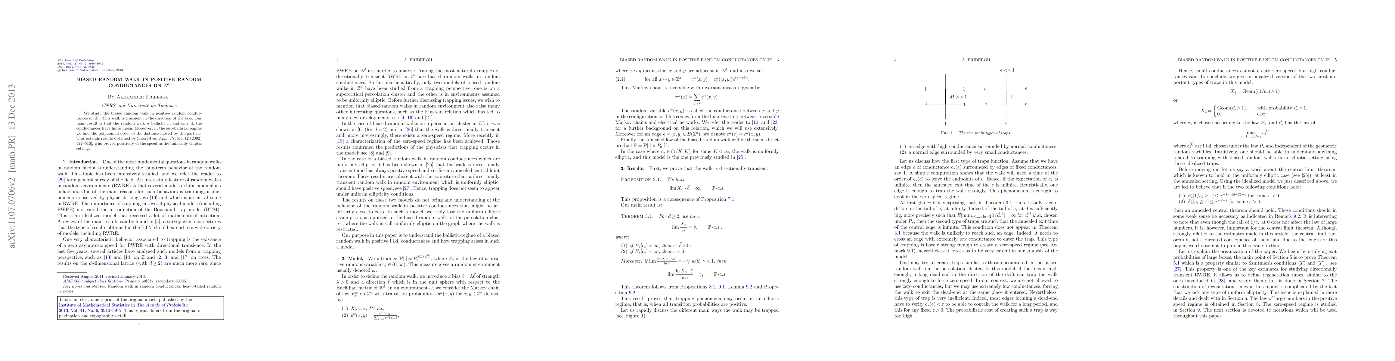 This paper investigates the behavior of a biased random walk in positive random conductances on $\mathbb{Z}^d$, showing it is transient in the direction of the bias. The main result establishes that the walk is ballistic if the conductances have a finite mean, and determines the polynomial order of the distance moved in the sub-ballistic regime.