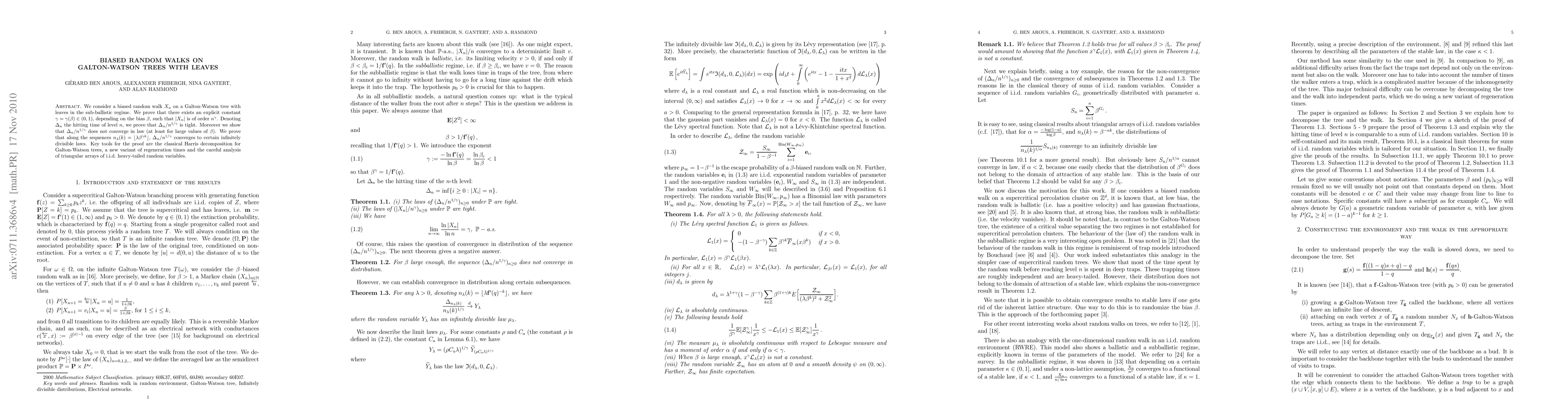 This paper studies a biased random walk on a Galton-Watson tree, proving that the walk scales as $n^{\gamma}$ with $\gamma$ depending on the bias. It shows that the normalized hitting time does not converge in law but converges along specific sequences to infinitely divisible laws, using tools like the Harris decomposition and analysis of heavy-tailed variables.