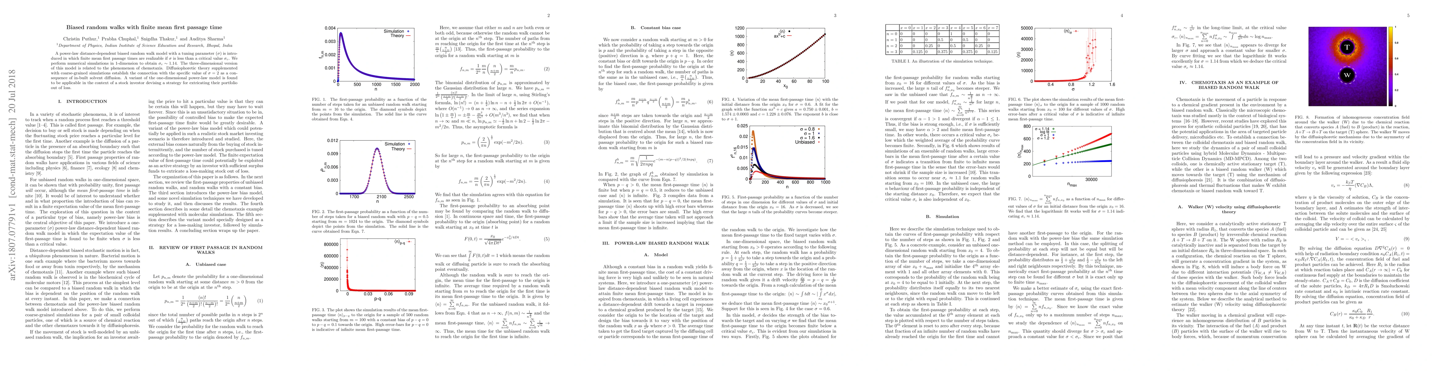 A power-law distance-dependent biased random walk model with a tuning parameter ($\sigma$) is introduced in which finite mean first passage times are realizable if $\sigma$ is less than a critical value $\sigma_c$. We perform numerical simulations in $1$-dimension to obtain $\sigma_c \sim 1.14$. The three-dimensional version of this model is related to the phenomenon of chemotaxis. Diffusiophoretic theory supplemented with coarse-grained simulations establish the connection with the specific value of $\sigma = 2$ as a consequence of in-built solvent diffusion. A variant of the one-dimensional power-law model is found to be applicable in the context of a stock investor devising a strategy for extricating their portfolio out of loss.