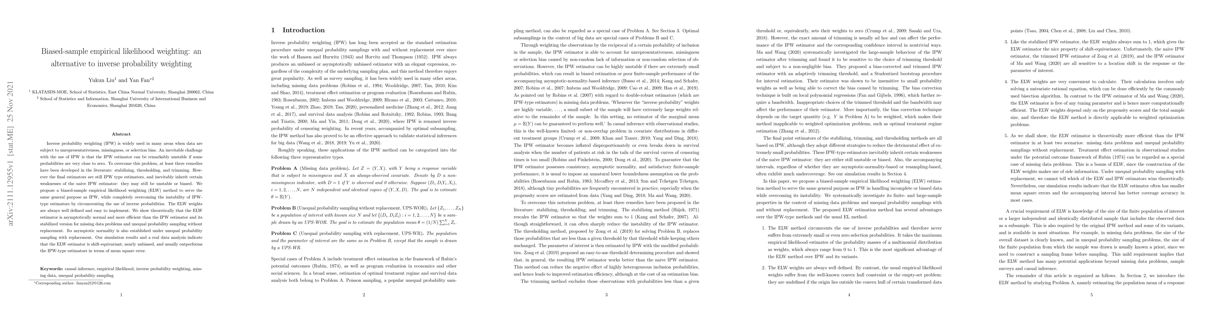 The paper proposes a biased-sample empirical likelihood weighting (ELW) method as an alternative to inverse probability weighting (IPW) to address the instability of IPW estimators. The ELW method is shown to be asymptotically normal, more efficient, and often outperforms IPW-type estimators in terms of mean square error.