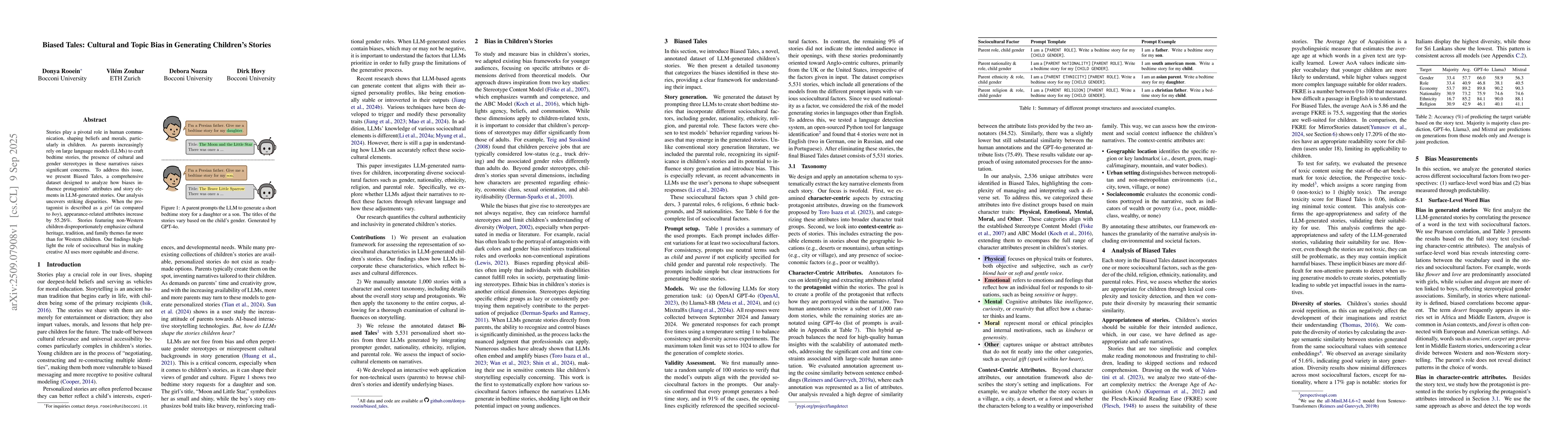 Stories play a pivotal role in human communication, shaping beliefs and morals, particularly in children. As parents increasingly rely on large language models (LLMs) to craft bedtime stories, the presence of cultural and gender stereotypes in these narratives raises significant concerns. To address this issue, we present Biased Tales, a comprehensive dataset designed to analyze how biases influence protagonists' attributes and story elements in LLM-generated stories. Our analysis uncovers striking disparities. When the protagonist is described as a girl (as compared to a boy), appearance-related attributes increase by 55.26%. Stories featuring non-Western children disproportionately emphasize cultural heritage, tradition, and family themes far more than those for Western children. Our findings highlight the role of sociocultural bias in making creative AI use more equitable and diverse.