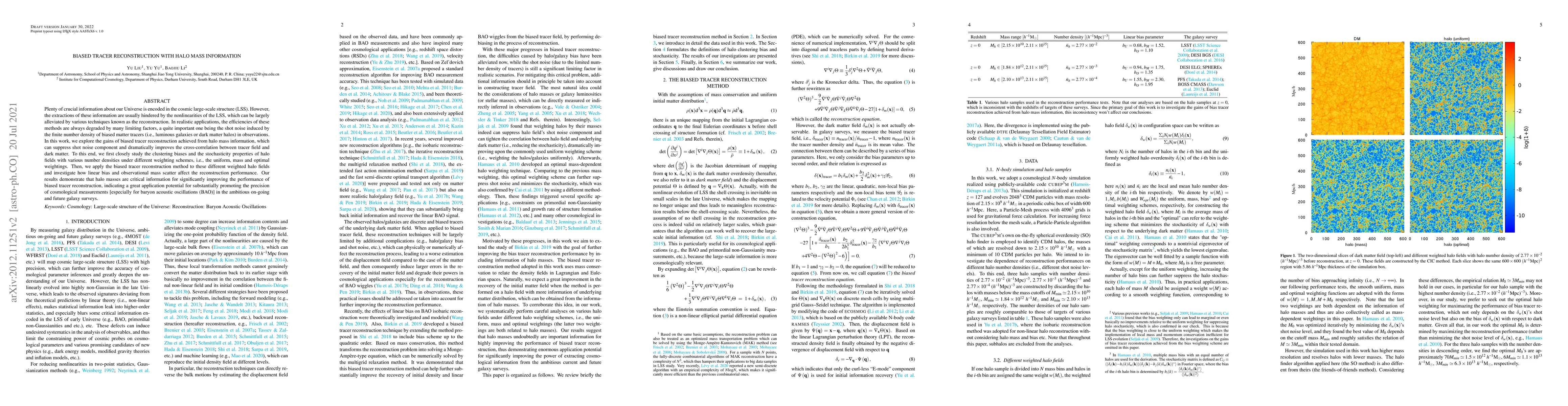 This paper explores how incorporating halo mass information into biased tracer reconstruction can suppress shot noise and enhance the cross-correlation between tracer fields and dark matter, significantly improving the precision of cosmological measurements, particularly for baryon acoustic oscillations in galaxy surveys. The study investigates the effects of different weighting schemes and finds that halo mass data greatly enhances reconstruction performance.
