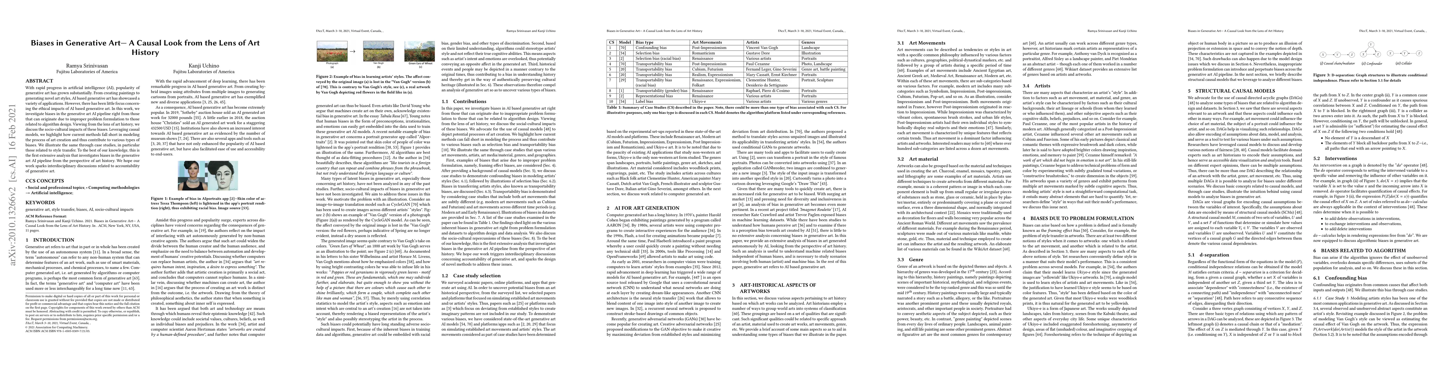 This paper investigates biases in AI-generated art, examining how improper problem formulation and algorithm design contribute to socio-cultural impacts. It uses causal models to highlight shortcomings in current generative art methods, particularly in style transfer, and aims to spark interdisciplinary discussions on the accountability of generative art.