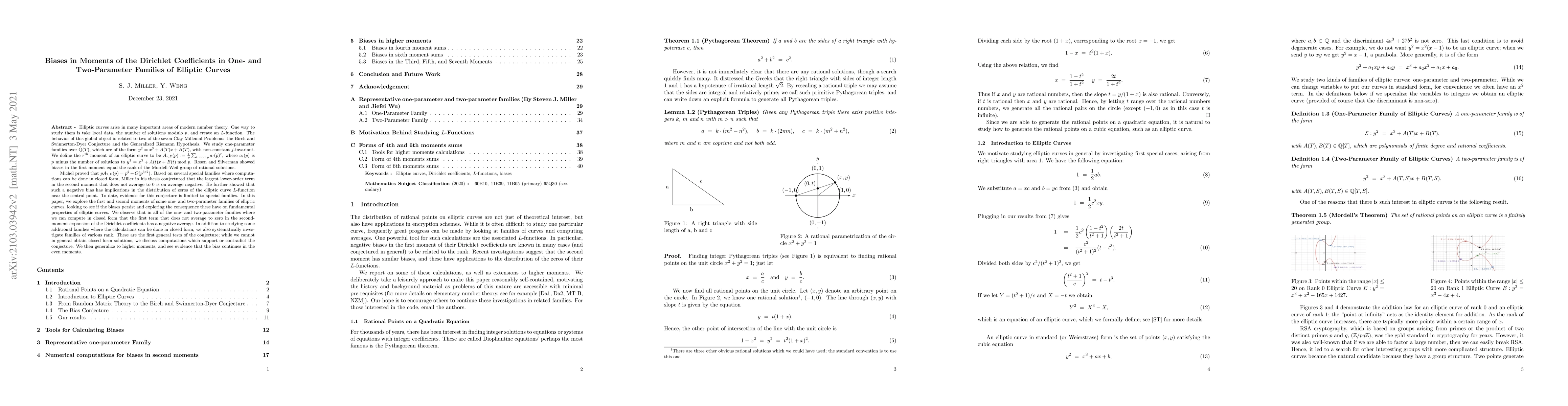 We study one-parameter families of elliptic curves over $\mathbb{Q}(T)$, which are of the form $y^2=x^3+A(T)x+B(T)$, with non-constant $j$-invariant. We define the $r$\textsuperscript{th} moment of an elliptic curve to be $A_{r,E}(p) := \frac1{p} \sum_{t \bmod p} a_t(p)^r$, where $a_t(p)$ is $p$ minus the number of solutions to $y^2 = x^3 + A(t)x + B(t) \bmod p$. Rosen and Silverman showed biases in the first moment equal the rank of the Mordell-Weil group of rational solutions. Michel proved that $pA_{2,E}(p)=p^2+O(p^{3/2})$. Based on several special families where computations can be done in closed form, Miller in his thesis conjectured that the largest lower-order term in the second moment that does not average to $0$ is on average negative. He further showed that such a negative bias has implications in the distribution of zeros of the elliptic curve $L$-function near the central point. To date, evidence for this conjecture is limited to special families. In this paper, we explore the first and second moments of some one- and two-parameter families of elliptic curves, looking to see if the biases persist and exploring the consequence these have on fundamental properties of elliptic curves. We observe that in all of the one- and two-parameter families where we can compute in closed form that the first term that does not average to zero in the second-moment expansion of the Dirichlet coefficients has a negative average. In addition to studying some additional families where the calculations can be done in closed form, we also systematically investigate families of various rank. These are the first general tests of the conjecture; while we cannot in general obtain closed form solutions, we discuss computations which support or contradict the conjecture. We then generalize to higher moments, and see evidence that the bias continues in the even moments.