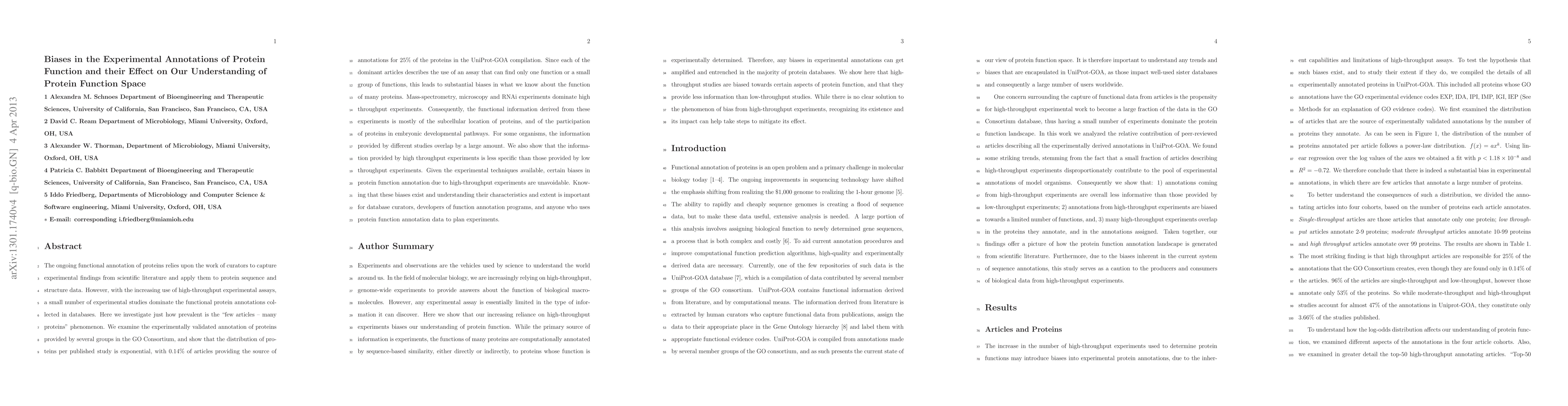 The ongoing functional annotation of proteins relies upon the work of curators to capture experimental findings from scientific literature and apply them to protein sequence and structure data. However, with the increasing use of high-throughput experimental assays, a small number of experimental studies dominate the functional protein annotations collected in databases. Here we investigate just how prevalent is the "few articles -- many proteins" phenomenon. We examine the experimentally validated annotation of proteins provided by several groups in the GO Consortium, and show that the distribution of proteins per published study is exponential, with 0.14% of articles providing the source of annotations for 25% of the proteins in the UniProt-GOA compilation. Since each of the dominant articles describes the use of an assay that can find only one function or a small group of functions, this leads to substantial biases in what we know about the function of many proteins. Mass-spectrometry, microscopy and RNAi experiments dominate high throughput experiments. Consequently, the functional information derived from these experiments is mostly of the subcellular location of proteins, and of the participation of proteins in embryonic developmental pathways. For some organisms, the information provided by different studies overlap by a large amount. We also show that the information provided by high throughput experiments is less specific than those provided by low throughput experiments. Given the experimental techniques available, certain biases in protein function annotation due to high-throughput experiments are unavoidable. Knowing that these biases exist and understanding their characteristics and extent is important for database curators, developers of function annotation programs, and anyone who uses protein function annotation data to plan experiments.