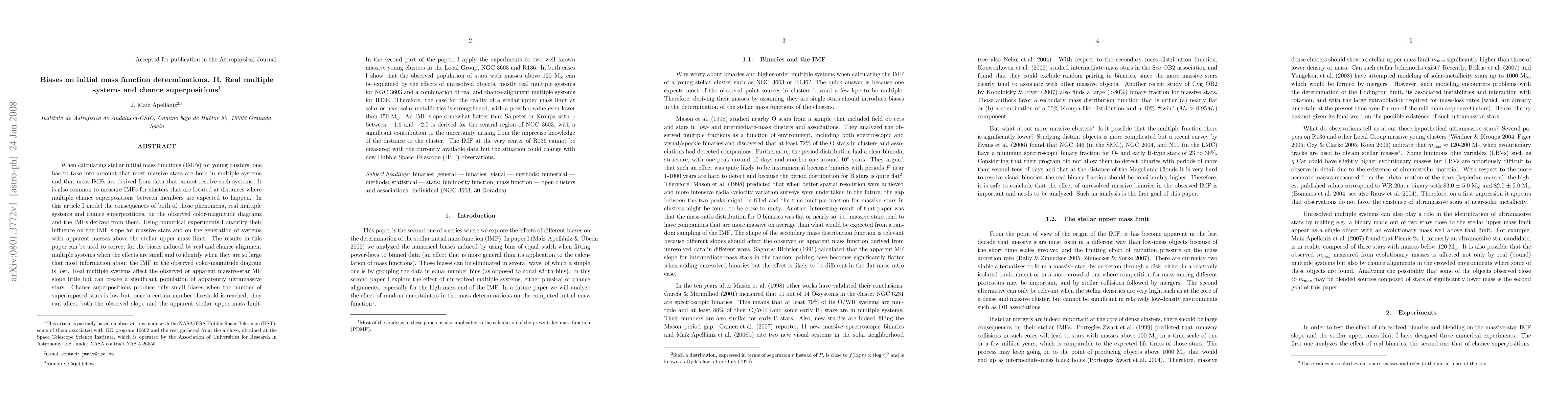 When calculating IMFs for young clusters, one has to take into account that (a) most massive stars are born in multiple systems (b) most IMFs are derived from data that cannot resolve such systems, and (c) multiple chance superpositions between members are expected to happen if the cluster is too distant. In this article I use numerical experiments to model the consequences of those phenomena on the observed color-magnitude diagrams and the IMFs derived from them. Real multiple systems affect the observed or apparent massive-star MF slope little but can create a significant population of apparently ultramassive stars. Chance superpositions produce only small biases when the number of superimposed stars is low but, once a certain number threshold is reached, they can affect both the observed slope and the apparent stellar upper mass limit. I apply those experiments to two well known massive young clusters in the Local Group, NGC 3603 and R136. In both cases I show that the observed population of stars with masses above 120 solar masses can be explained by the effects of unresolved objects, mostly real multiple systems for NGC 3603 and a combination of real and chance-alignment multiple systems for R136. Therefore, the case for the reality of a stellar upper mass limit at solar or near-solar metallicities is strengthened, with a possible value even lower than 150 solar masses. An IMF slope somewhat flatter than Salpeter or Kroupa with gamma between -1.6 and -2.0 is derived for the central region of NGC 3603, with a significant contribution to the uncertainty arising from the imprecise knowledge of the distance to the cluster. The IMF at the very center of R136 cannot be measured with the currently available data but the situation could change with new HST observations. (abridged)