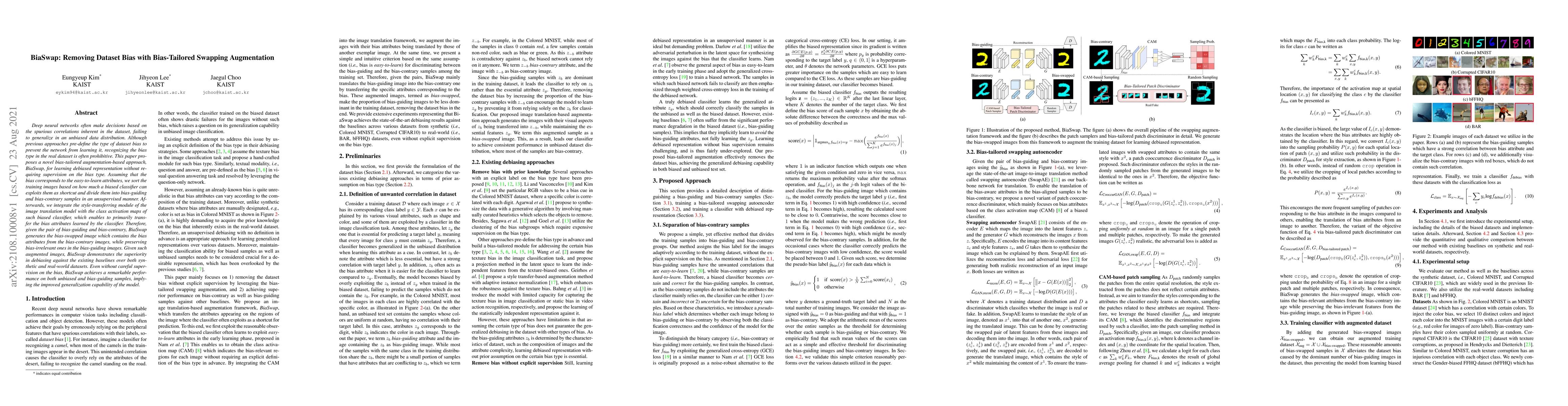 The paper proposes BiaSwap, a bias-tailored swapping augmentation approach for debiasing deep neural networks without supervision on bias type. It sorts training images based on exploitability as shortcut learning by a biased classifier and divides them into bias-guiding and bias-contrary samples. BiaSwap then generates bias-swapped images by transferring bias attributes from bias-contrary images to bias-guiding images, preserving bias-irrelevant features.