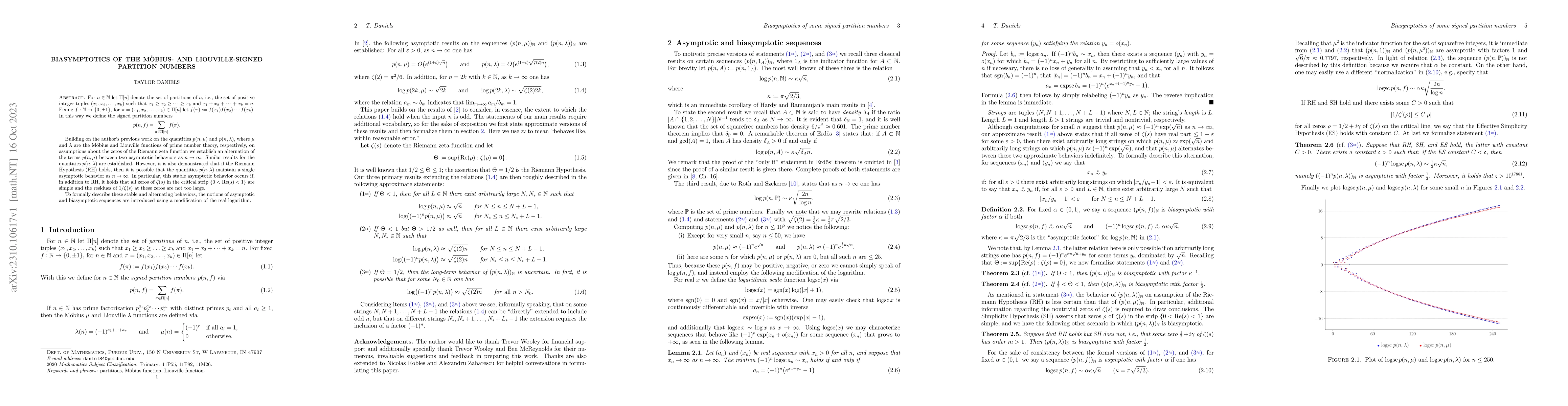 For $n \in \mathbb{N}$ let $\Pi[n]$ denote the set of partitions of $n$, i.e., the set of positive integer tuples $(x_1,x_2,\ldots,x_k)$ such that $x_1 \geq x_2 \geq \cdots \geq x_k$ and $x_1 + x_2 + \cdots + x_k = n$. Fixing $f:\mathbb{N}\to\{0,\pm 1\}$, for $\pi = (x_1,x_2,\ldots,x_k) \in \Pi[n]$ let $f(\pi) := f(x_1)f(x_2)\cdots f(x_k)$. In this way we define the {signed partition numbers} \[ p(n,f) = \sum_{\pi\in\Pi[n]} f(\pi). \] Building on the author's previous work on the quantities $p(n,\mu)$ and $p(n,\lambda)$, where $\mu$ and $\lambda$ are the M\"obius and Liouville functions of prime number theory, respectively, on assumptions about the zeros of the Riemann zeta function we establish an alternation of the terms $p(n,\mu)$ between two asymptotic behaviors as $n\to\infty$. Similar results for the quantities $p(n,\lambda)$ are established. However, it is also demonstrated that if the Riemann Hypothesis (RH) holds, then it is possible that the quantities $p(n,\lambda)$ maintain a single asymptotic behavior as $n\to\infty$. In particular, this stable asymptotic behavior occurs if, in addition to RH, it holds that all zeros of $\zeta(s)$ in the critical strip $\{0 < \Re(s) < 1\}$ are simple and the residues of $1/\zeta(s)$ at these zeros are not too large. To formally describe these stable and alternating behaviors, the notions of asymptotic and biasymptotic sequences are introduced using a modification of the real logarithm.