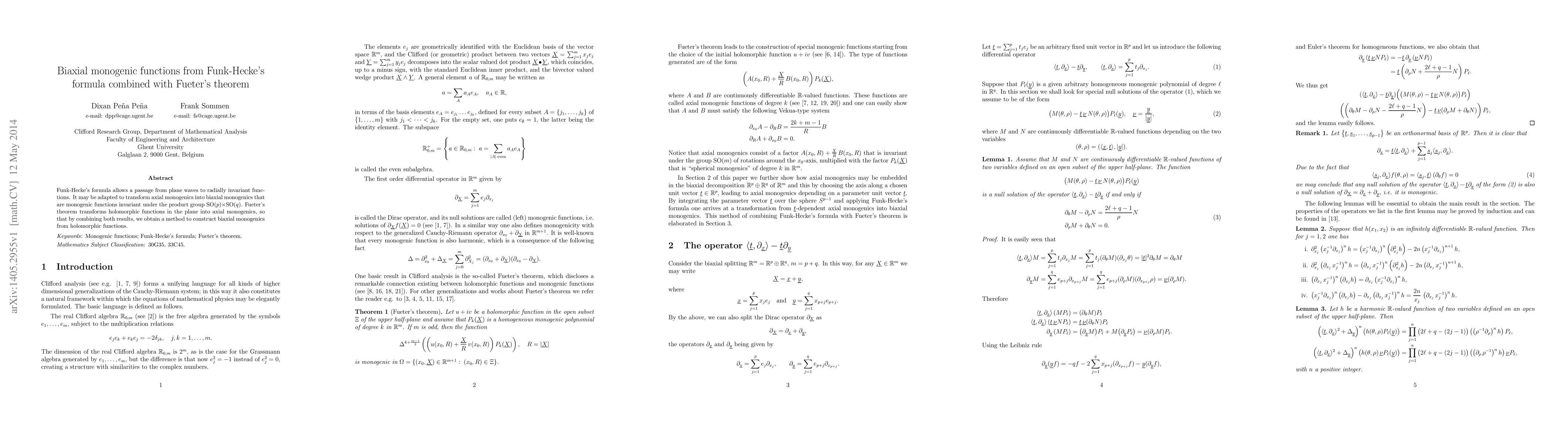 Summary: This paper combines Funk-Hecke's formula and Fueter's theorem to transform plane waves into radially invariant functions, enabling the construction of biaxial monogenics—monogenic functions invariant under the product group SO(p)xSO(q)—from holomorphic functions. The method provides a novel approach to generating biaxial monogenics.