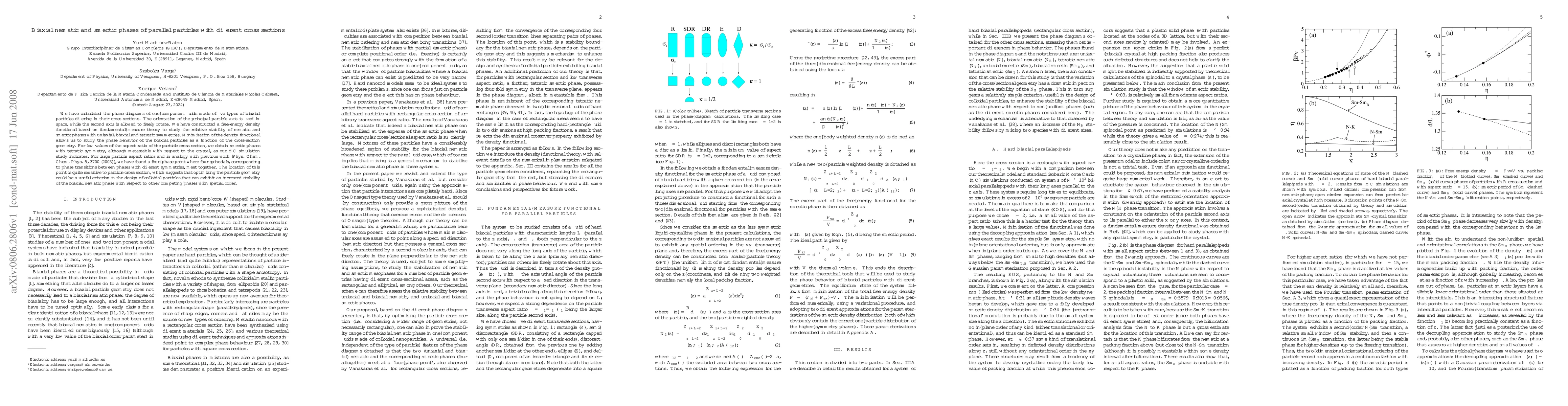 We have calculated the phase diagrams of one--component fluids made of five types of biaxial particles differing in their cross sections. The orientation of the principal particle axis is fixed in space, while the second axis is allowed to freely rotate. We have constructed a free-energy density functional based on fundamental--measure theory to study the relative stability of nematic and smectic phases with uniaxial, biaxial and tetratic symmetries. Minimization of the density functional allows us to study the phase behavior of the biaxial particles as a function of the cross-section geometry. For low values of the aspect ratio of the particle cross section, we obtain smectic phases with tetratic symmetry, although metastable with respect to the crystal, as our MC simulation study indicates. For large particle aspect ratios and in analogy with previous work [Phys. Chem. Chem. Phys. 5, 3700 (2003)], we have found a four--phase point where four spinodals, corresponding to phase transitions between phases with different symmetries, meet together. The location of this point is quite sensitive to particle cross section, which suggests that optimizing the particle geometry could be a useful criterion in the design of colloidal particles that can exhibit an increased stability of the biaxial nematic phase with respect to other competing phases with spatial order.