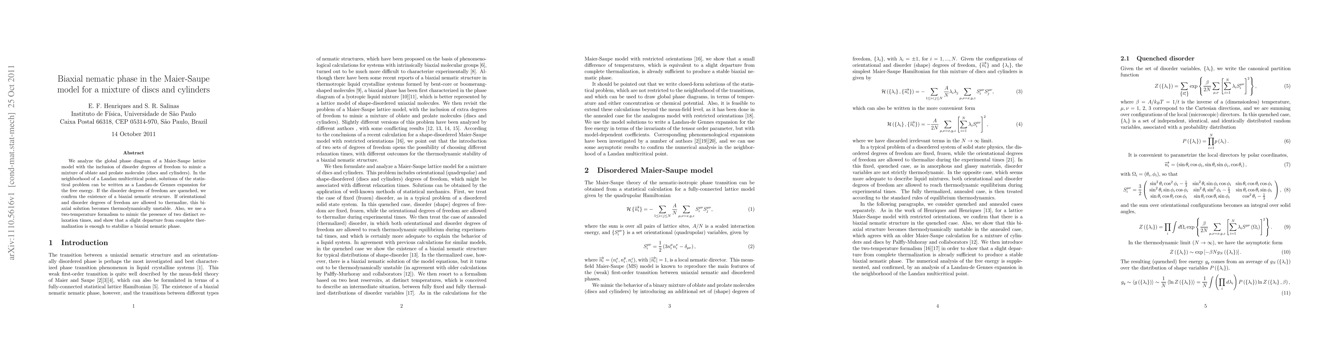 We analyze the global phase diagram of a Maier-Saupe lattice model with the inclusion of disorder degrees of freedom to mimic a mixture of oblate and prolate molecules (discs and cylinders). In the neighborhood of a Landau multicritical point, solutions of the statistical problem can be written as a Landau-de Gennes expansion for the free energy. If the disorder degrees of freedom are quenched, we confirm the existence of a biaxial nematic strucure. If orientational and disorder degrees of freedom are allowed to thermalize, this biaxial solution becomes thermodynamically unstable. Also, we use a two-temperature formalism to mimic the presence of two distinct relaxation times, and show that a slight departure from complete thermalization is enough to stabilize a biaxial nematic phase.