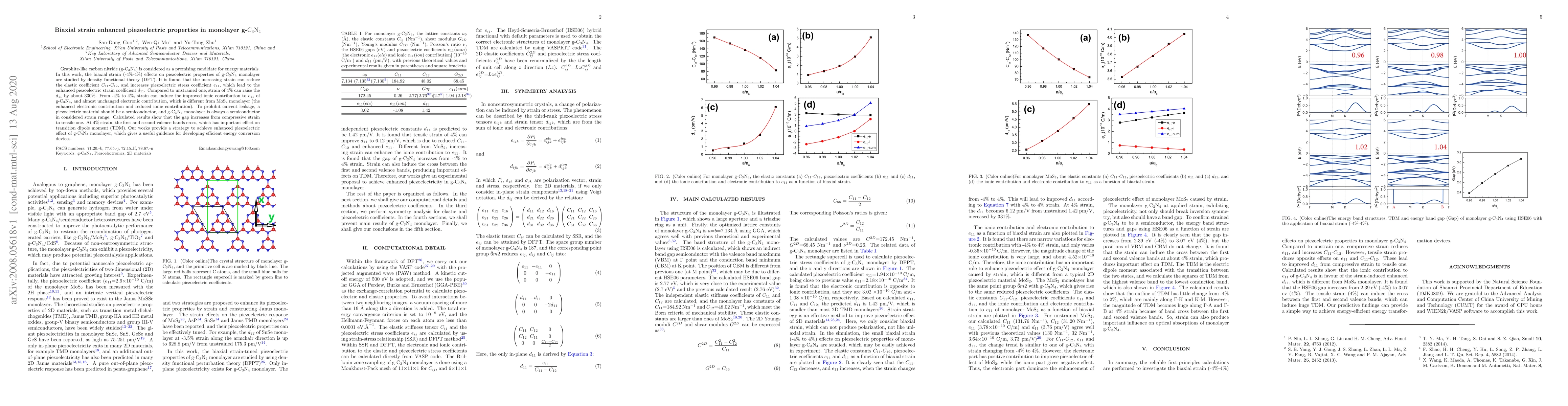 Graphite-like carbon nitride (g-$\mathrm{C_3N_4}$) is considered as a promising candidate for energy materials. In this work, the biaxial strain (-4\%-4\%) effects on piezoelectric properties of g-$\mathrm{C_3N_4}$ monolayer are studied by density functional theory (DFT). It is found that the increasing strain can reduce the elastic coefficient $C_{11}$-$C_{12}$, and increases piezoelectric stress coefficient $e_{11}$, which lead to the enhanced piezoelectric strain coefficient $d_{11}$. Compared to unstrained one, strain of 4\% can raise the $d_{11}$ by about 330\%. From -4\% to 4\%, strain can induce the improved ionic contribution to $e_{11}$ of g-$\mathrm{C_3N_4}$, and almost unchanged electronic contribution, which is different from $\mathrm{MoS_2}$ monolayer (the enhanced electronic contribution and reduced ionic contribution). To prohibit current leakage, a piezoelectric material should be a semiconductor, and g-$\mathrm{C_3N_4}$ monolayer is always a semiconductor in considered strain range. Calculated results show that the gap increases from compressive strain to tensile one. At 4\% strain, the first and second valence bands cross, which has important effect on transition dipole moment (TDM). Our works provide a strategy to achieve enhanced piezoelectric effect of g-$\mathrm{C_3N_4}$ monolayer, which gives a useful guidence for developing efficient energy conversion devices.