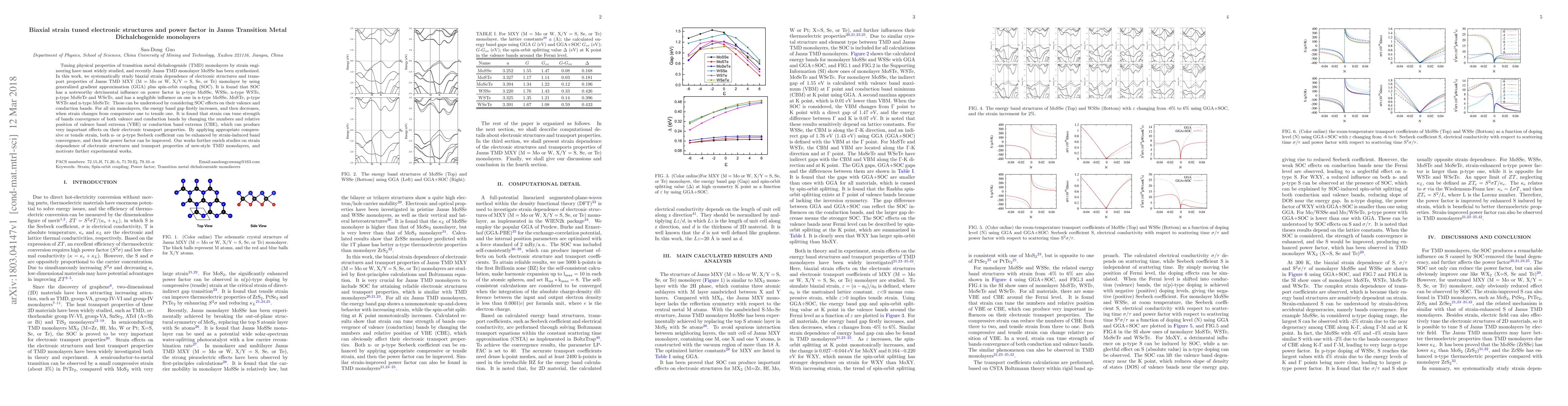 This research investigates the impact of biaxial strain on the electronic structures and transport properties of Janus transition metal dichalcogenide monolayers (MXY, where M = Mo or W, X/Y = S, Se, or Te). Using GGA+SOC calculations, it finds that spin-orbit coupling significantly influences the power factor in specific configurations, and strain engineering can enhance both n- and p-type Seebeck coefficients, thereby improving the power factor through strain-induced band convergence.