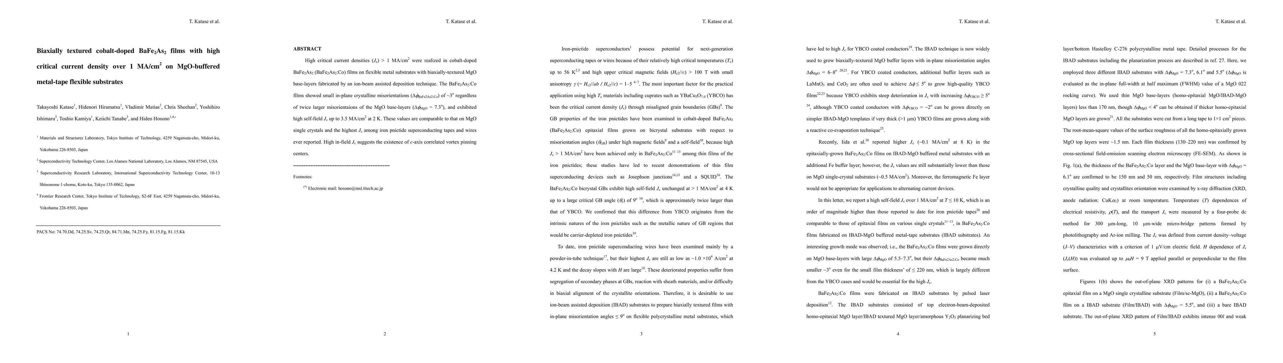 This paper reports high critical current densities (Jc) exceeding 1 MA/cm² in cobalt-doped BaFe2As2 films on flexible metal substrates, achieved through biaxially-textured MgO base layers using ion-beam assisted deposition. The films exhibit minimal in-plane misorientations and high self-field Jc up to 3.5 MA/cm² at 2 K, indicating effective c-axis vortex pinning.