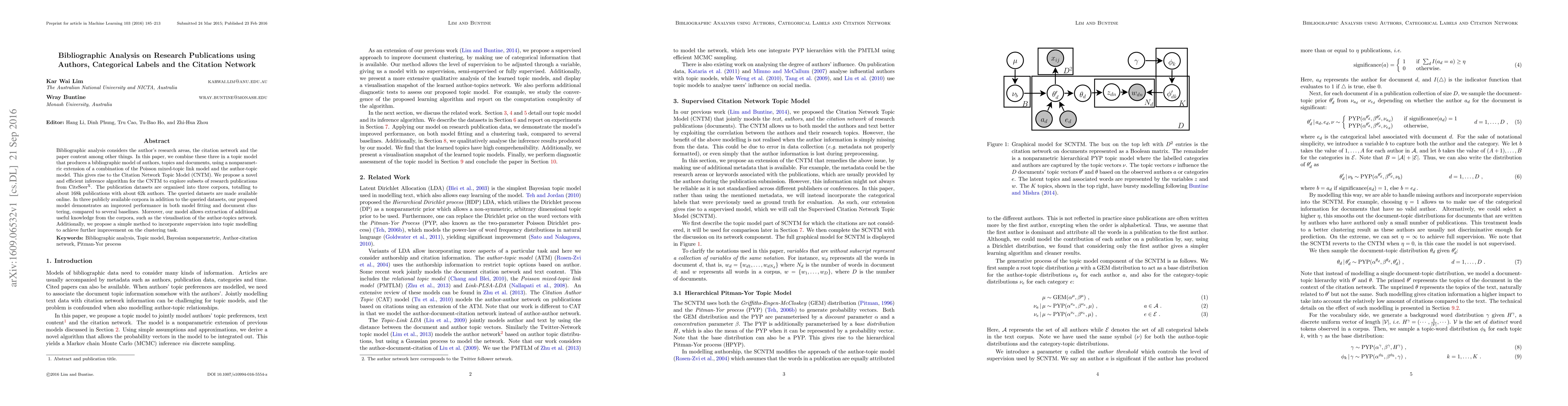 Bibliographic analysis considers the author's research areas, the citation network and the paper content among other things. In this paper, we combine these three in a topic model that produces a bibliographic model of authors, topics and documents, using a nonparametric extension of a combination of the Poisson mixed-topic link model and the author-topic model. This gives rise to the Citation Network Topic Model (CNTM). We propose a novel and efficient inference algorithm for the CNTM to explore subsets of research publications from CiteSeerX. The publication datasets are organised into three corpora, totalling to about 168k publications with about 62k authors. The queried datasets are made available online. In three publicly available corpora in addition to the queried datasets, our proposed model demonstrates an improved performance in both model fitting and document clustering, compared to several baselines. Moreover, our model allows extraction of additional useful knowledge from the corpora, such as the visualisation of the author-topics network. Additionally, we propose a simple method to incorporate supervision into topic modelling to achieve further improvement on the clustering task.