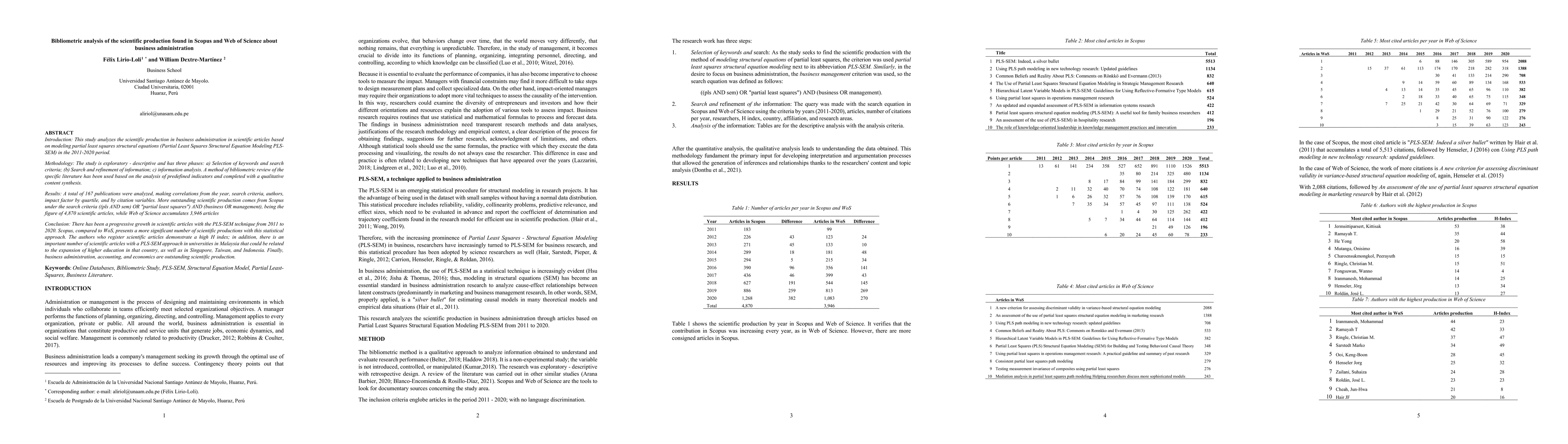 This study conducts a bibliometric analysis of business administration scientific production in Scopus and Web of Science (2011-2020) using PLS-SEM, revealing a progressive growth in articles and a higher number of publications in Scopus compared to Web of Science. Key areas of focus include business administration, accounting, and economics.