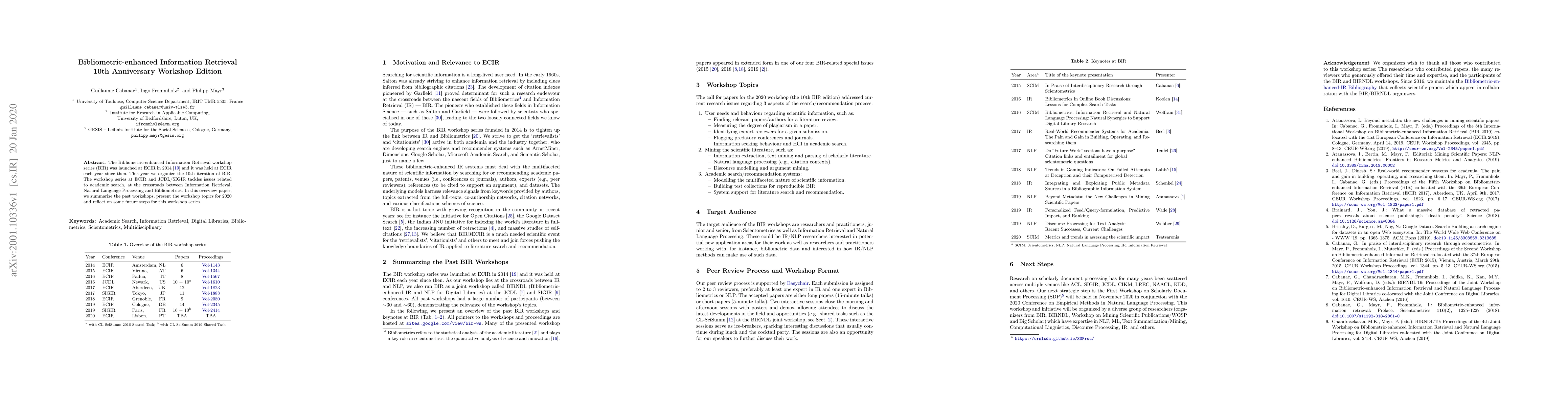 The Bibliometric-enhanced Information Retrieval workshop series (BIR) was launched at ECIR in 2014 \cite{MayrEtAl2014} and it was held at ECIR each year since then. This year we organize the 10th iteration of BIR. The workshop series at ECIR and JCDL/SIGIR tackles issues related to academic search, at the crossroads between Information Retrieval, Natural Language Processing and Bibliometrics. In this overview paper, we summarize the past workshops, present the workshop topics for 2020 and reflect on some future steps for this workshop series.