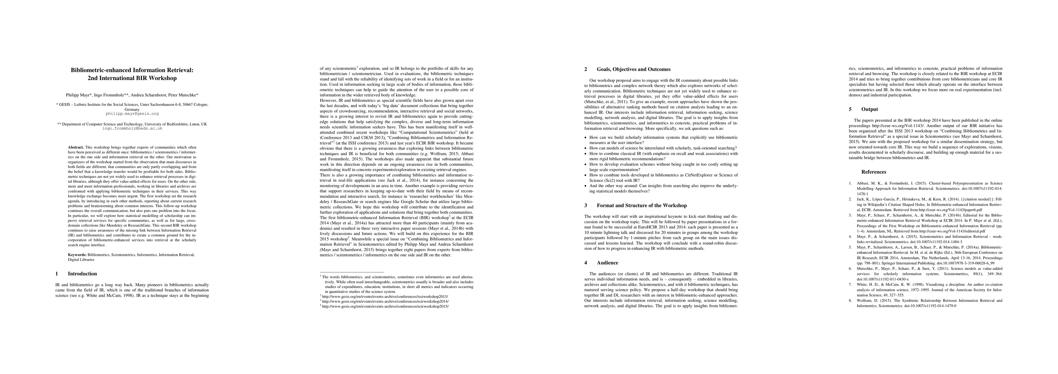 The workshop contributes to the identification and further exploration of methods that apply insights from bibliometrics, scientometrics, and informetrics to practical problems in information retrieval and browsing.