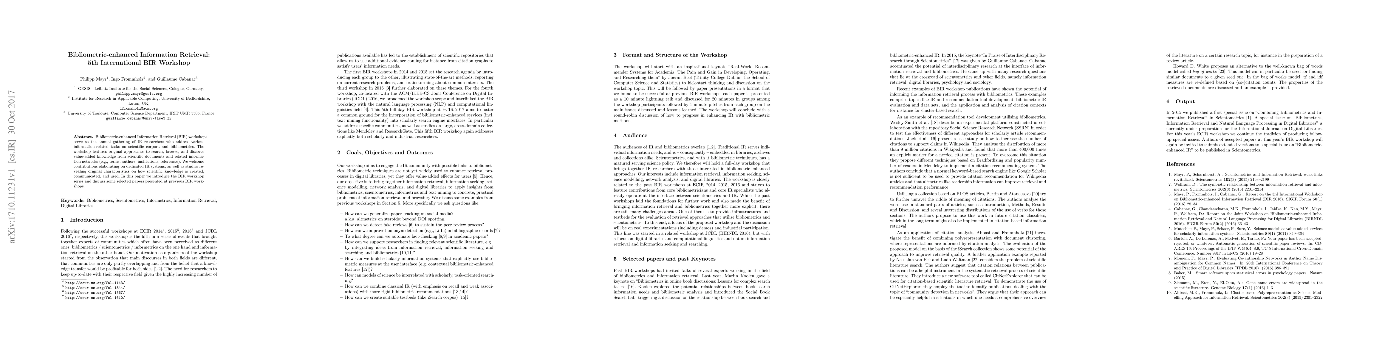 Bibliometric-enhanced Information Retrieval (BIR) workshops serve as the annual gathering of IR researchers who address various information-related tasks on scientific corpora and bibliometrics. The workshop features original approaches to search, browse, and discover value-added knowledge from scientific documents and related information networks (e.g., terms, authors, institutions, references). We welcome contributions elaborating on dedicated IR systems, as well as studies revealing original characteristics on how scientific knowledge is created, communicated, and used. In this paper we introduce the BIR workshop series and discuss some selected papers presented at previous BIR workshops.