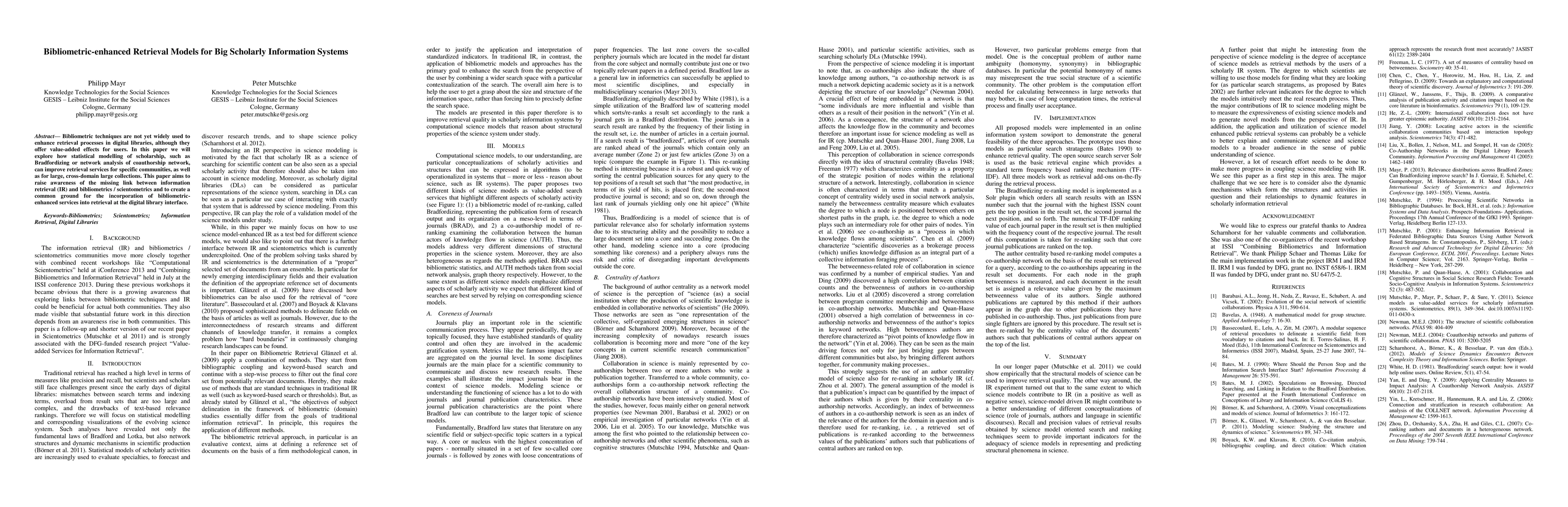 This paper investigates the integration of bibliometric techniques, like Bradfordizing and coauthorship network analysis, to enhance retrieval models in digital libraries, aiming to improve services for specific communities and large, cross-domain collections. It seeks to bridge the gap between information retrieval and bibliometrics to foster better retrieval services.
