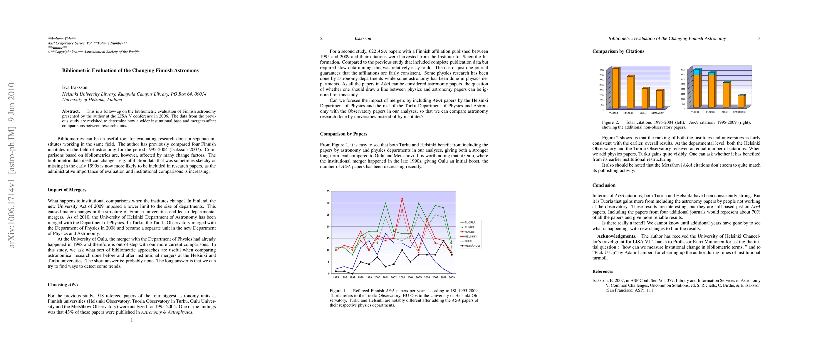The study demonstrates a bibliometric approach to evaluating the impact of institutional changes on research unit comparisons in Finnish astronomy, focusing on A&A publications and citations.