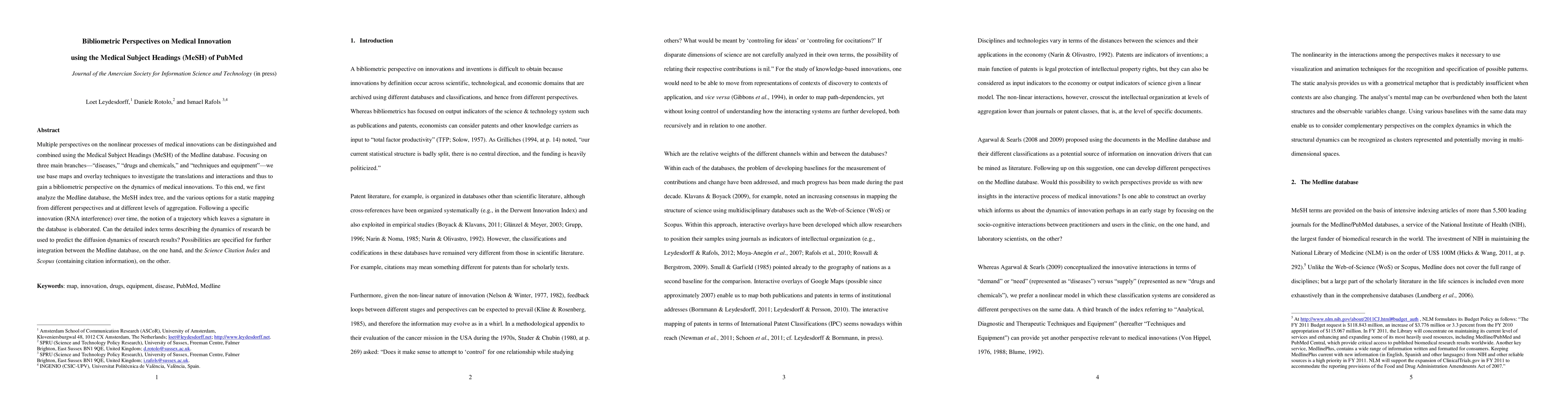 Multiple perspectives on the nonlinear processes of medical innovations can be distinguished and combined using the Medical Subject Headings (MeSH) of the Medline database. Focusing on three main branches-"diseases," "drugs and chemicals," and "techniques and equipment"-we use base maps and overlay techniques to investigate the translations and interactions and thus to gain a bibliometric perspective on the dynamics of medical innovations. To this end, we first analyze the Medline database, the MeSH index tree, and the various options for a static mapping from different perspectives and at different levels of aggregation. Following a specific innovation (RNA interference) over time, the notion of a trajectory which leaves a signature in the database is elaborated. Can the detailed index terms describing the dynamics of research be used to predict the diffusion dynamics of research results? Possibilities are specified for further integration between the Medline database, on the one hand, and the Science Citation Index and Scopus (containing citation information), on the other.