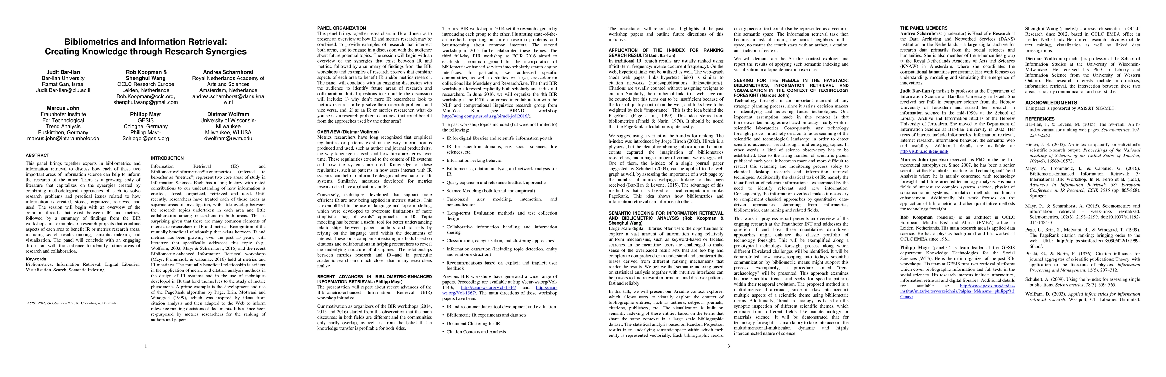 This panel explores the synergies between bibliometrics and information retrieval, highlighting how combined methodological approaches can address research problems and practical issues in information science. It concludes with an interactive discussion on future research opportunities and collaborations.