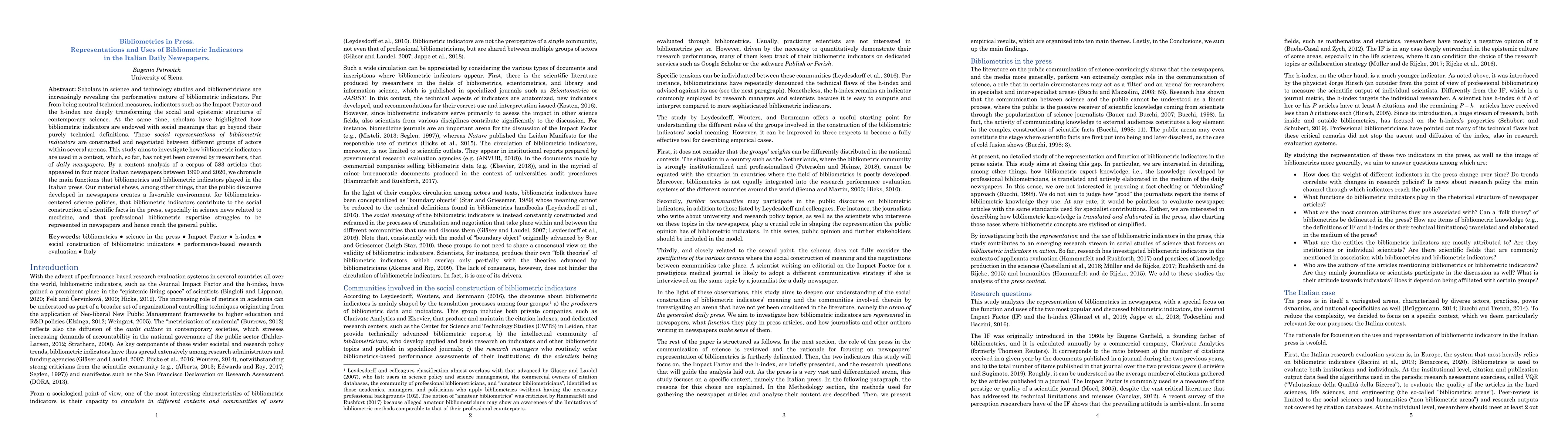 This study examines how bibliometric indicators are represented and used in Italian daily newspapers, revealing their transformative impact on science policies and the social construction of scientific facts, particularly in medical news, while professional bibliometric expertise remains underrepresented in public discourse.