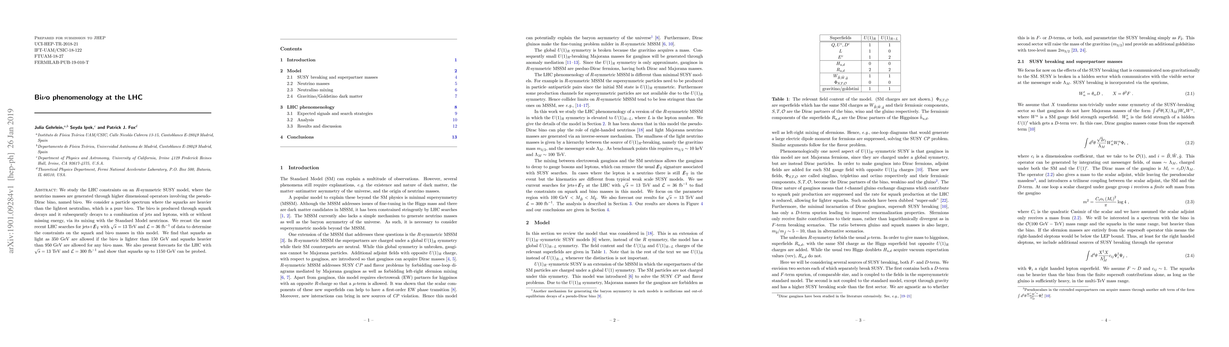 Researchers studied LHC constraints on an $R$-symmetric SUSY model that generates neutrino masses through a pseudo-Dirac bino called bi$ u$o, finding that squarks can be as light as 350 GeV under certain conditions.