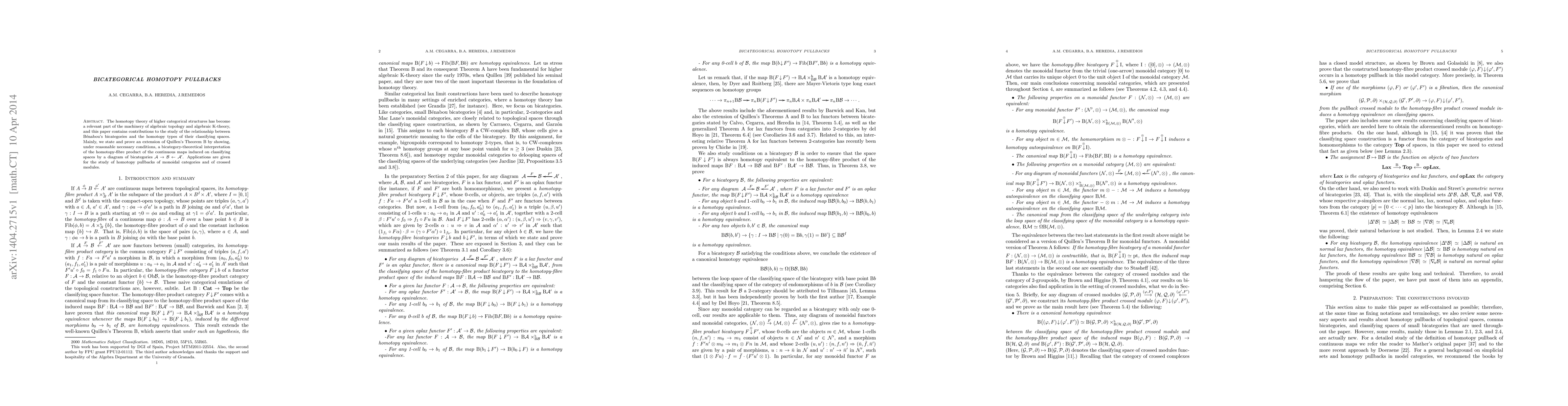 The homotopy theory of higher categorical structures has become a relevant part of the machinery of algebraic topology and algebraic K-theory, and this paper contains contributions to the study of the relationship between B\'enabou's bicategories and the homotopy types of their classifying spaces. Mainly, we state and prove an extension of Quillen's Theorem B by showing, under reasonable necessary conditions, a bicategory-theoretical interpretation of the homotopy-fibre product of the continuous maps induced on classifying spaces by a diagram of bicategories $\mathcal{A}\to\mathcal{B}\leftarrow \mathcal{A}'$. Applications are given for the study of homotopy pullbacks of monoidal categories and of crossed modules.