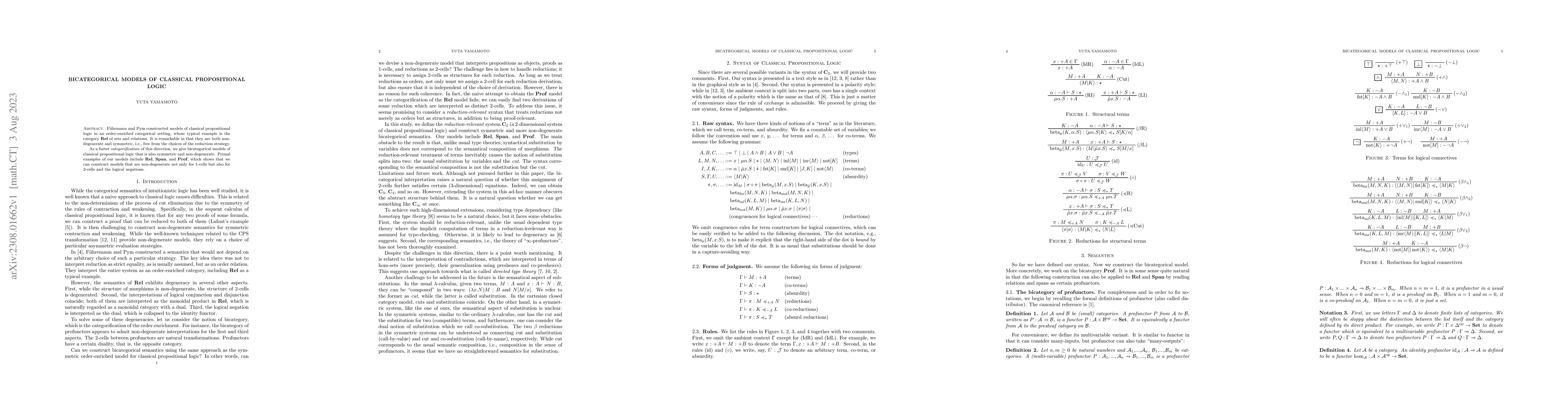 F\"uhrmann and Pym constructed models of classical propositional logic in an order-enriched categorical setting, whose typical example is the category $\mathbf{Rel}$ of sets and relations. It is remarkable in that they are both non-degenerate and symmetric, i.e., free from the choices of the reduction strategy. As a furter categorification of this direction, we give bicategorical models of classical propositional logic that is also symmetric and non-degenerate. Primal examples of our models include $\mathbf{Rel}$, $\mathbf{Span}$, and $\mathbf{Prof}$, which shows that we can construct models that are non-degenerate not only for $1$-cells but also for $2$-cells and the logical negations.