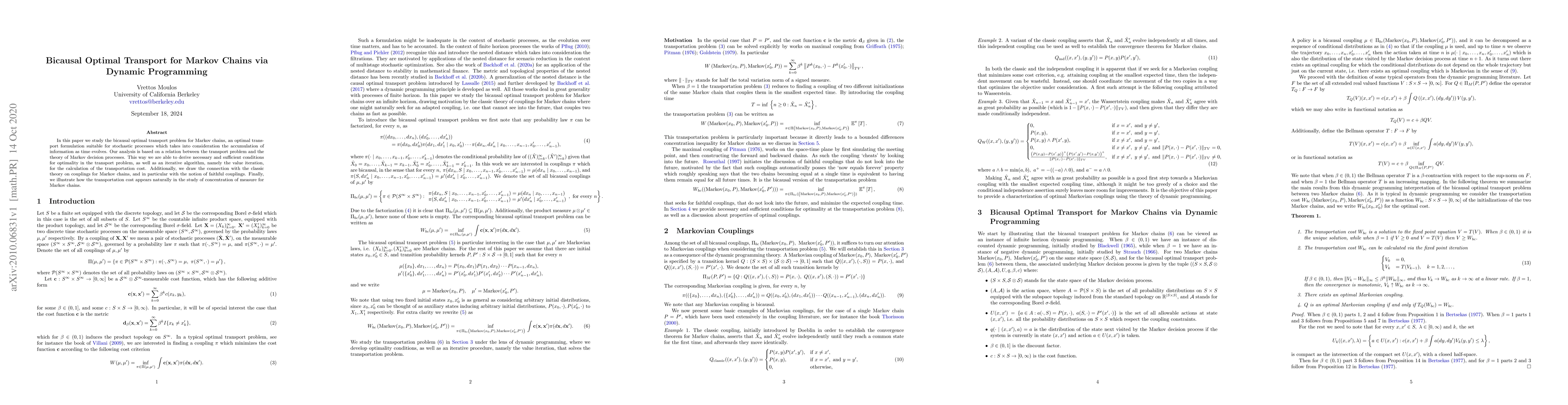 This paper explores the bicausal optimal transport problem for Markov chains, linking it to Markov decision processes to derive optimality conditions and an iterative value iteration algorithm. It also connects the transportation cost to the study of concentration of measure and faithful couplings in Markov chains.