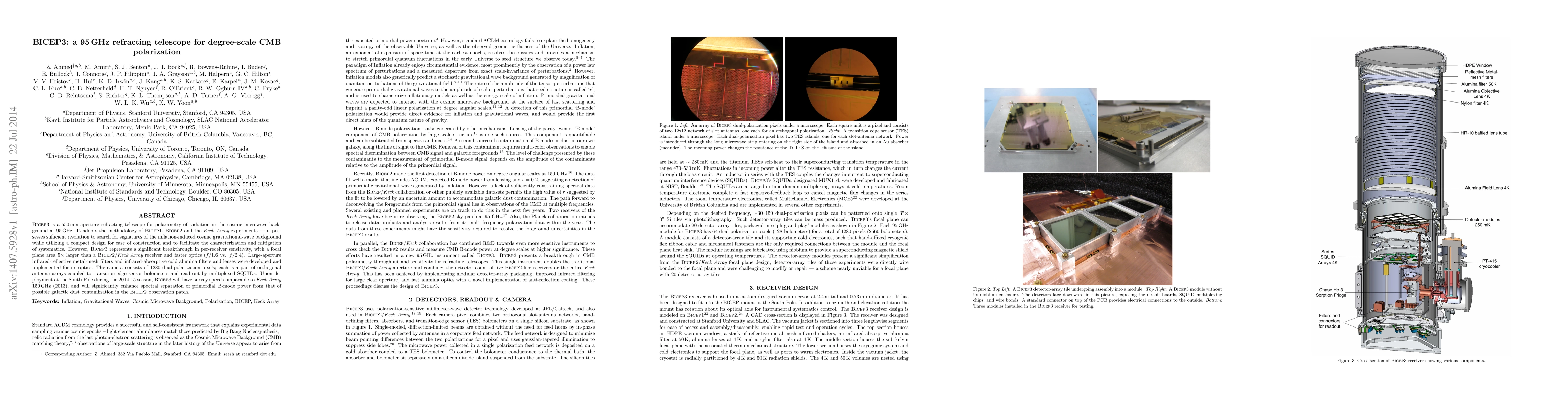 BICEP3 is a high-sensitivity 95 GHz telescope designed to detect cosmic microwave background polarization and search for gravitational waves from cosmic inflation, featuring improved sensitivity and optics compared to previous BICEP models. It will enhance the separation of primordial B-mode signals from galactic dust contamination when deployed at the South Pole.