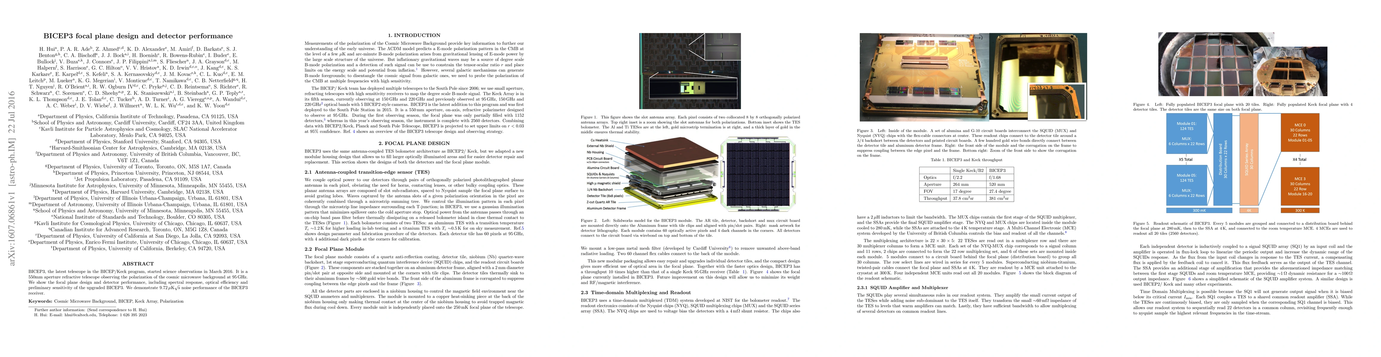 BICEP3, a 550mm aperture telescope observing cosmic microwave background polarization, presents its focal plane design and detector performance, achieving a noise performance of 9.72µK√s. The study details spectral response, optical efficiency, and preliminary sensitivity of the upgraded BICEP3 system.