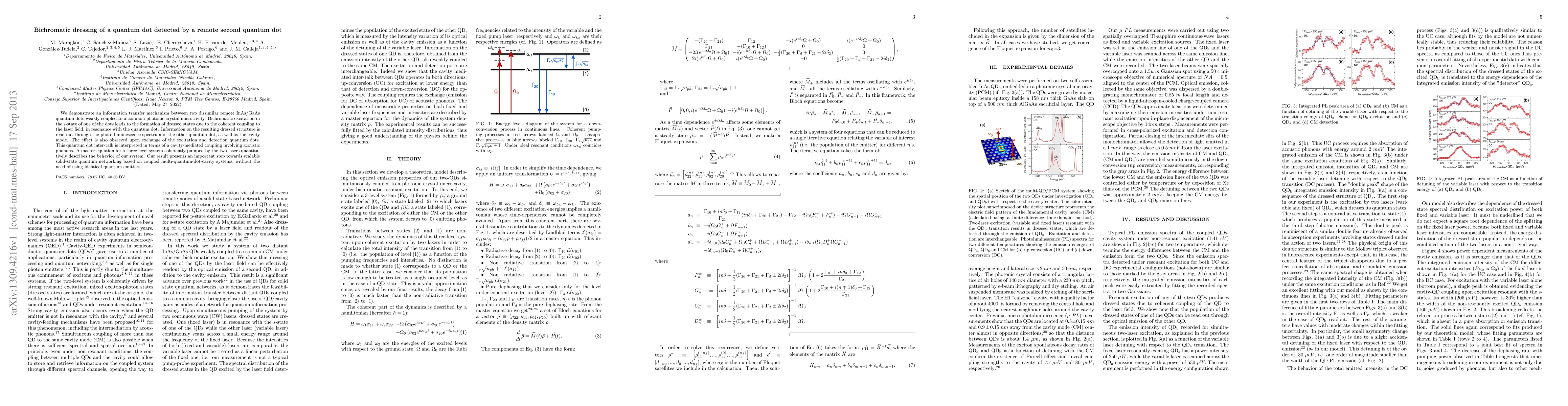 This paper demonstrates a mechanism for information transfer between two remote quantum dots via bichromatic excitation and coherent coupling to a photonic crystal microcavity, with readout through the photo-luminescence spectrum. The findings suggest scalable quantum networking potential using dissimilar quantum dots and cavity-mediated coupling.
