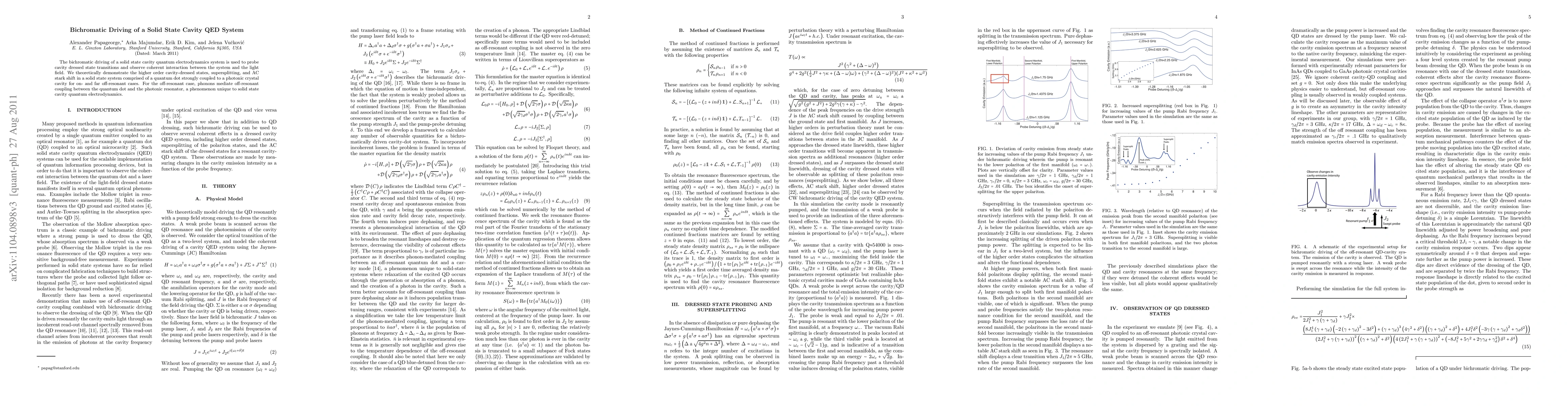 This paper investigates the effects of bichromatic driving on a solid state cavity QED system, demonstrating higher-order cavity-dressed states and off-resonant coupling mediated by phonons, revealing unique interactions in a quantum dot-photonic crystal cavity setup.