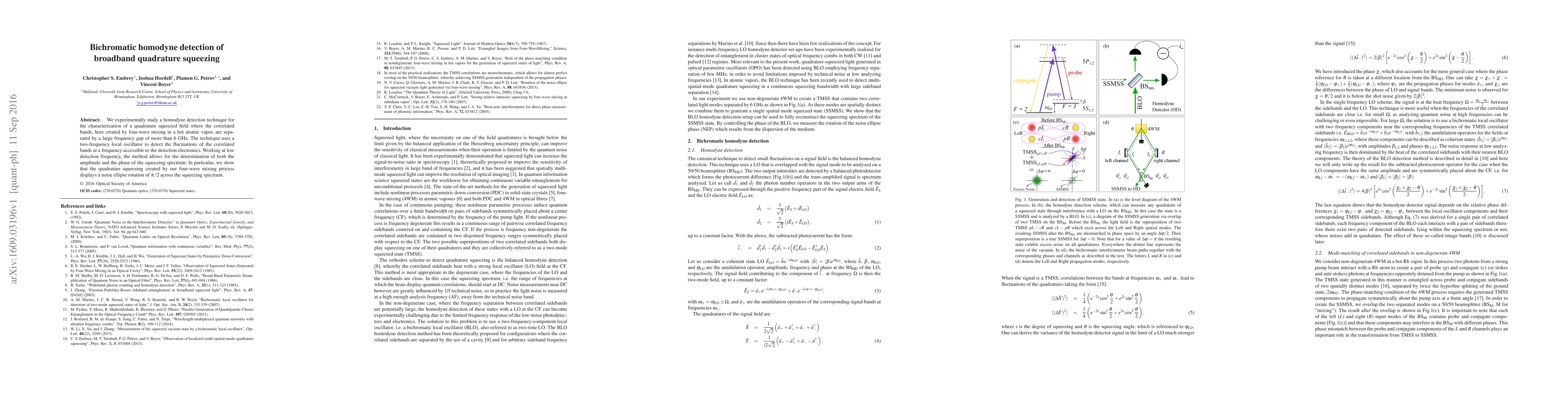 This paper presents a homodyne detection method for characterizing broadband quadrature squeezing generated by four-wave mixing in hot atomic vapor. The technique employs a two-frequency local oscillator to detect fluctuations at a manageable frequency, enabling the determination of both amplitude and phase of the squeezing spectrum, revealing a $\pi/2$ noise ellipse rotation across the spectrum.